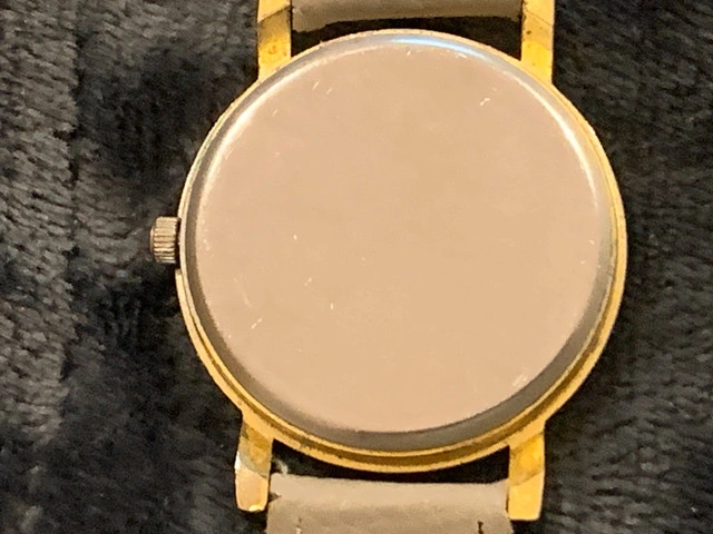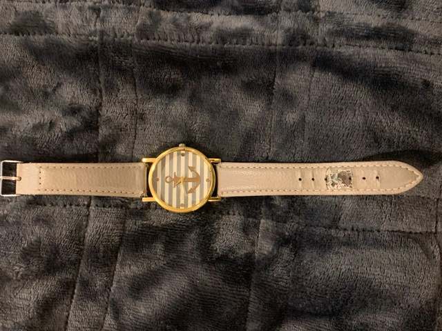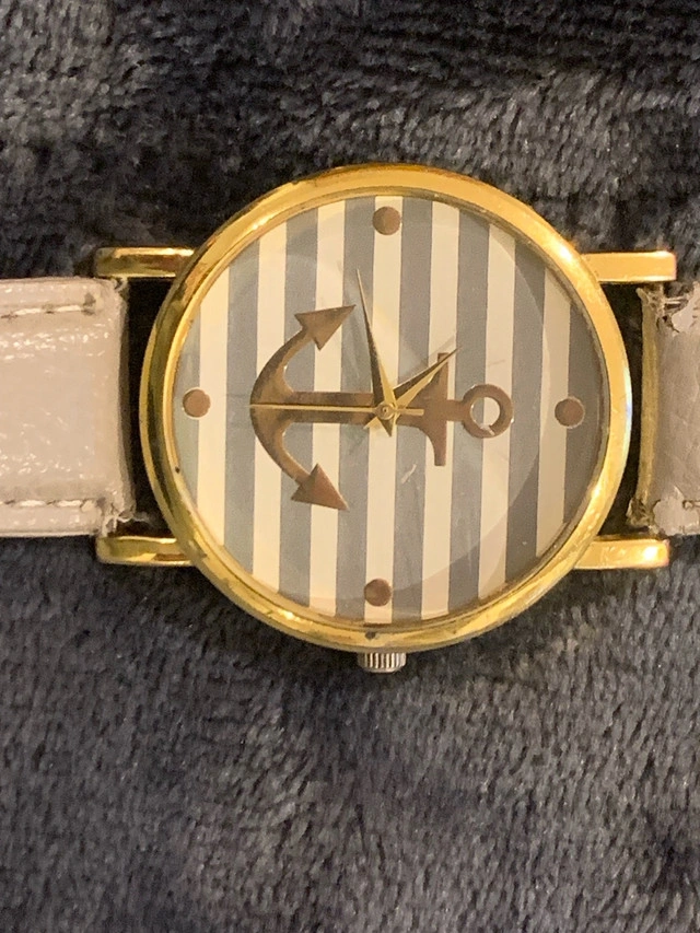 Ahoy boat and sea lovers. This quartz watch has an anchor for a dial face. Watch is running and will come with a battery installed. Wrist band has wear, see photos.