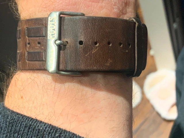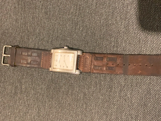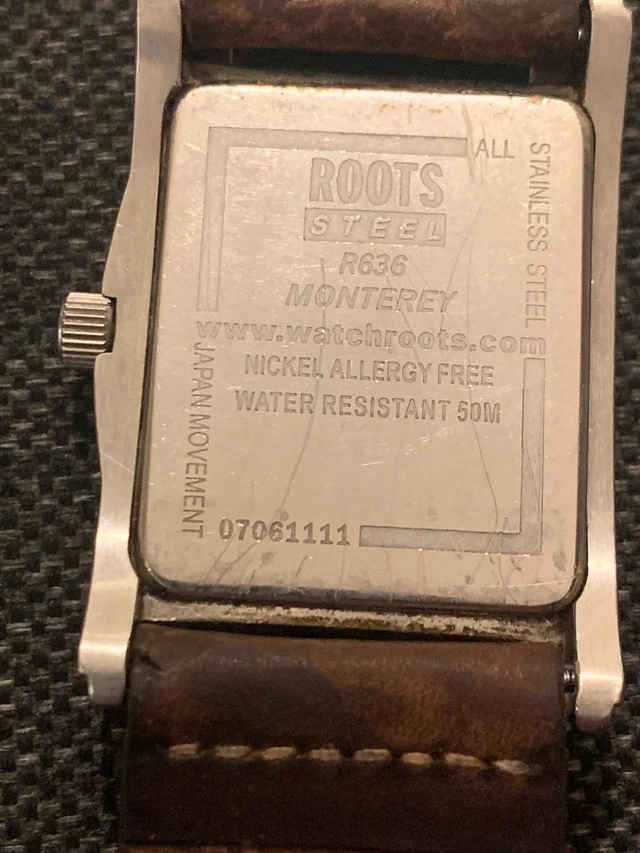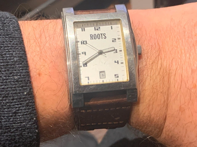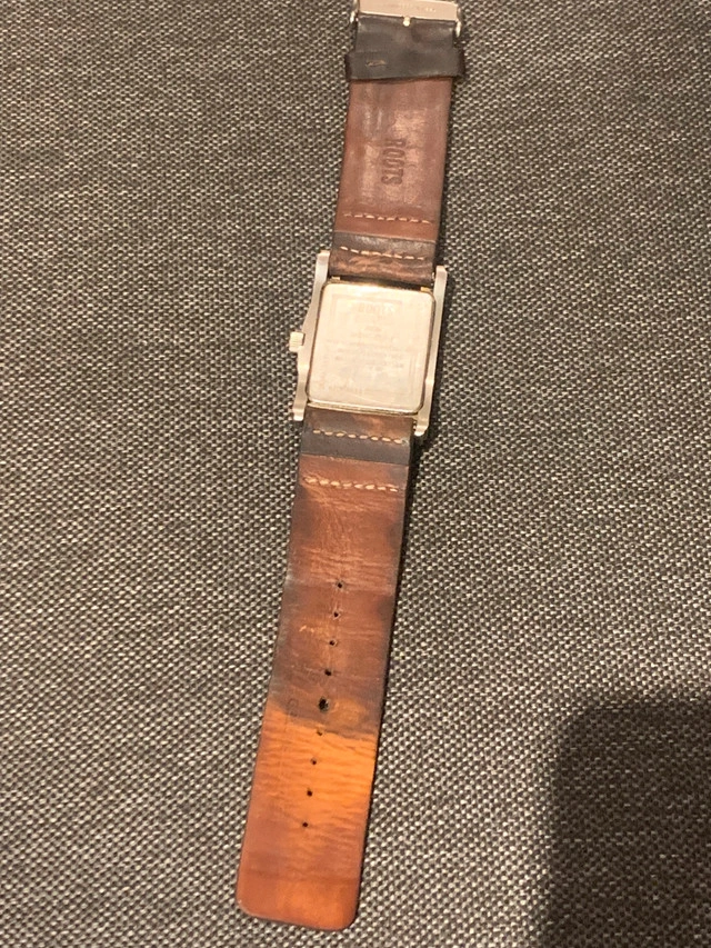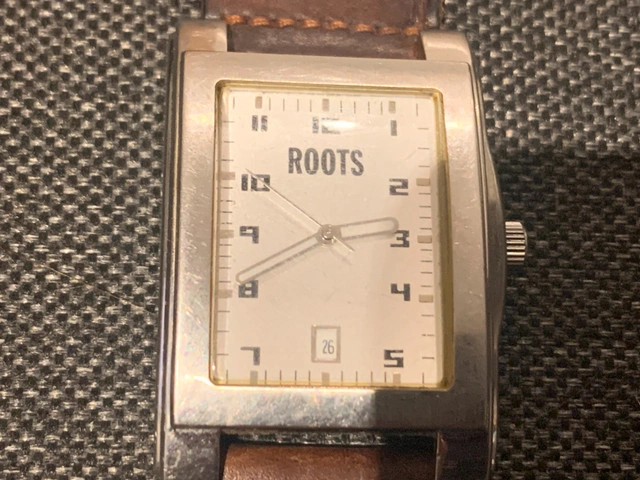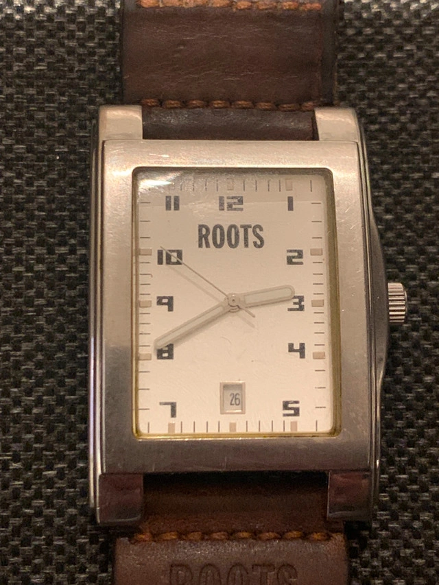 Here we have a men's Roots tank watch with an original Roots leather wrist band. The quartz movement is fully functional and comes with a battery.