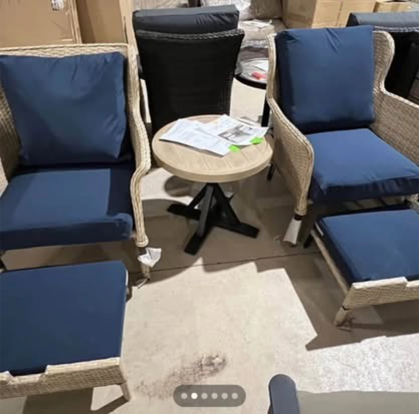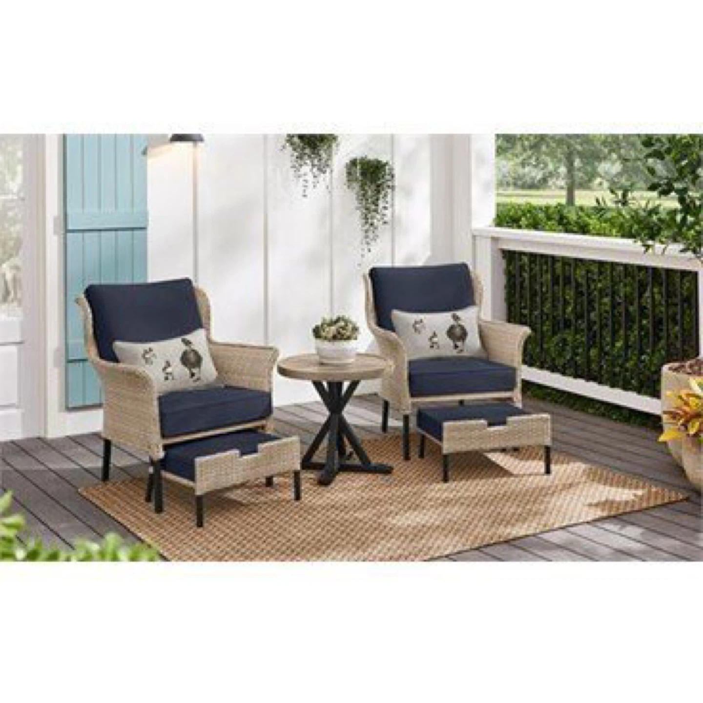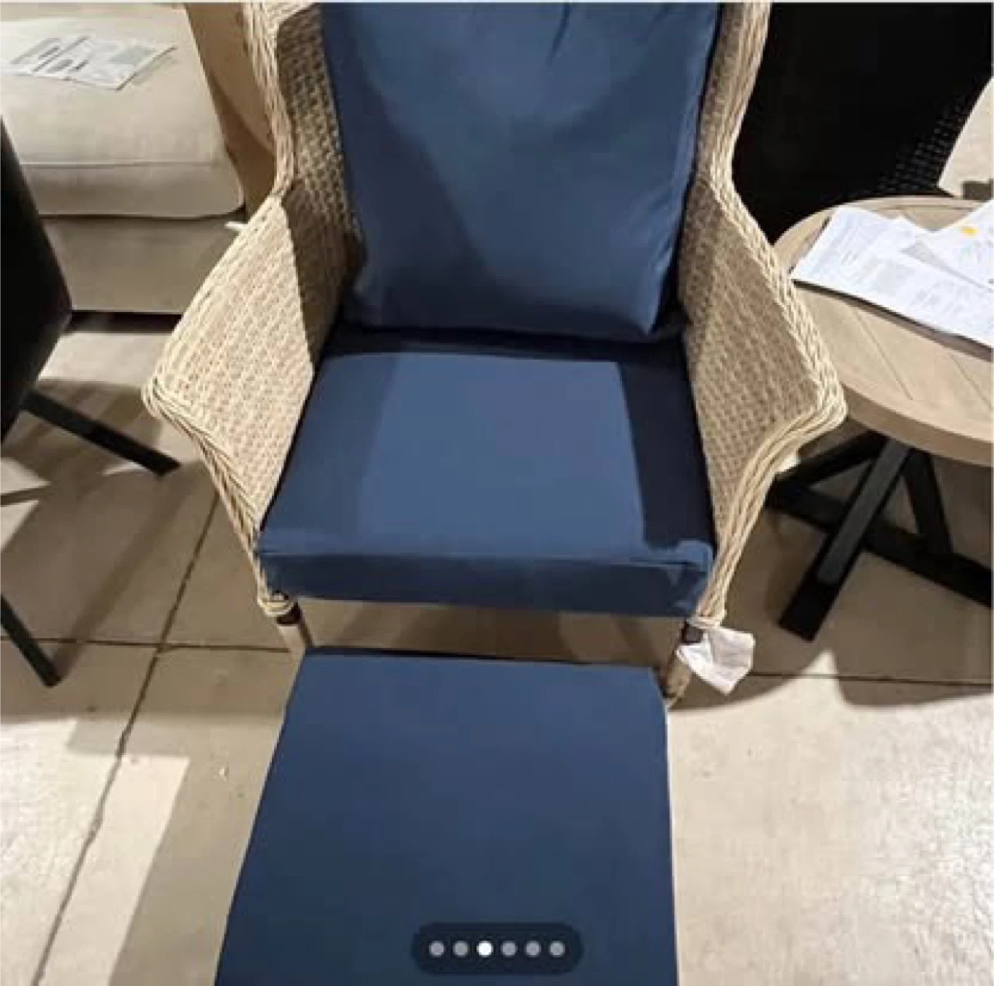 Comfy wicker patio set with a chair and ottoman, perfect for relaxing outdoors! The set comes with plush blue cushions for added comfort. Great for your deck or garden! Brand new in box Chair Back Height (in.) 11.81 Chair Back Width (in.) 25.98 Chair Depth (in.) 29.53 Chair Height (in.) 34.25 Chair Seat Depth (in.) 22.83 Chair Seat Width (in.) 22.05 Chair Width (in.) 29.53 Cushion Thickness (in.) 4.72 Seat Height (in.) 24.01 Table Height (in.) 20.08 Table Length (in.) 22.05 Table Width (in.) 22.05