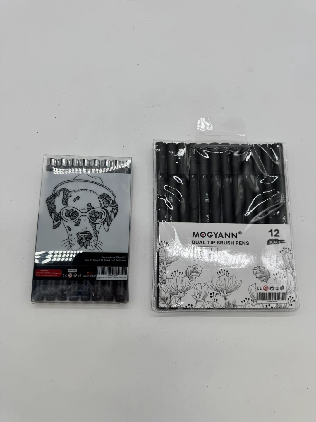 Selling a set of Mogyann dual tip brush pens! This set comes with 12 black pens. Perfect for art, drawing, and sketching Also 12 pack Mogyann pigment liners.