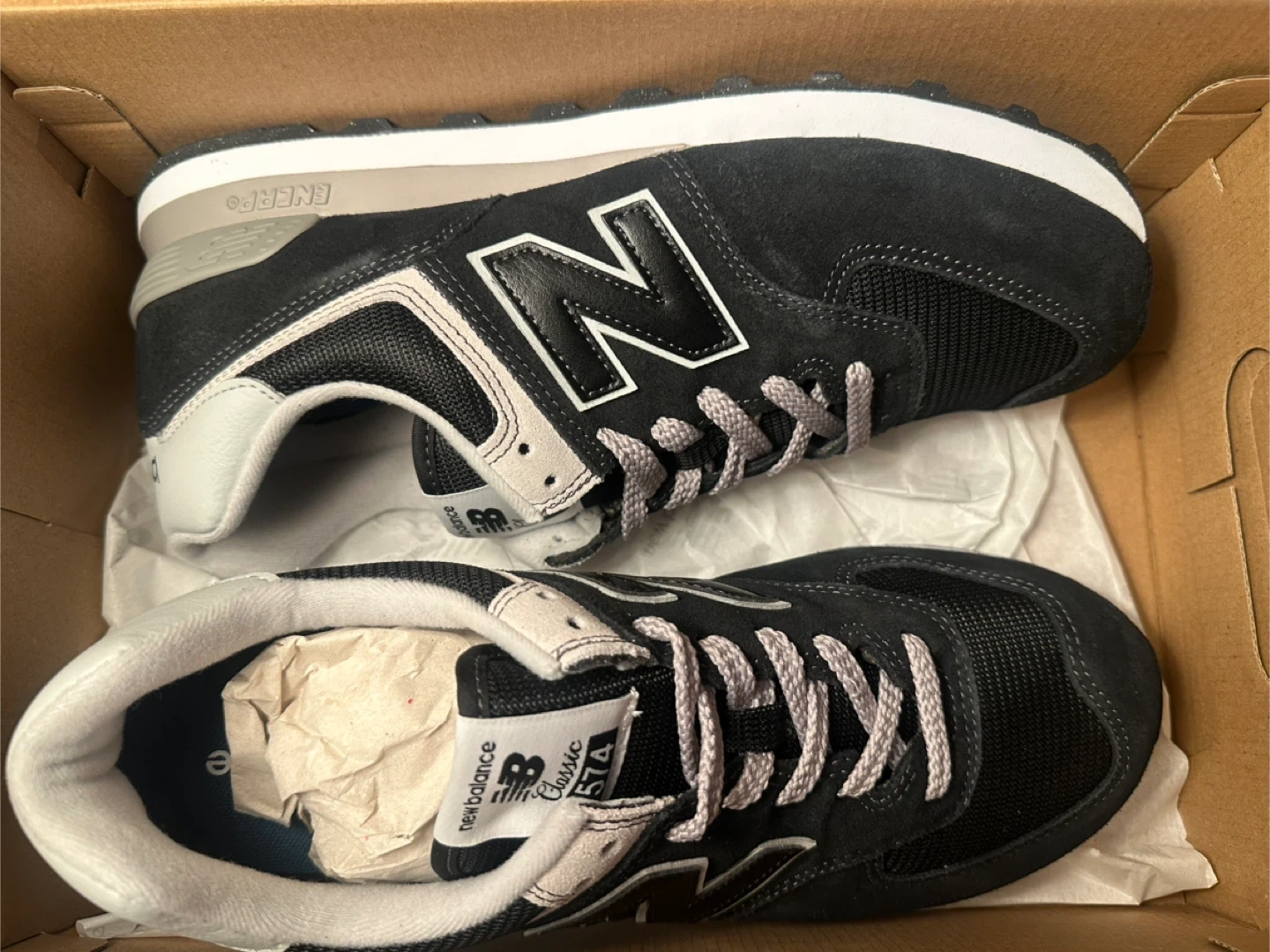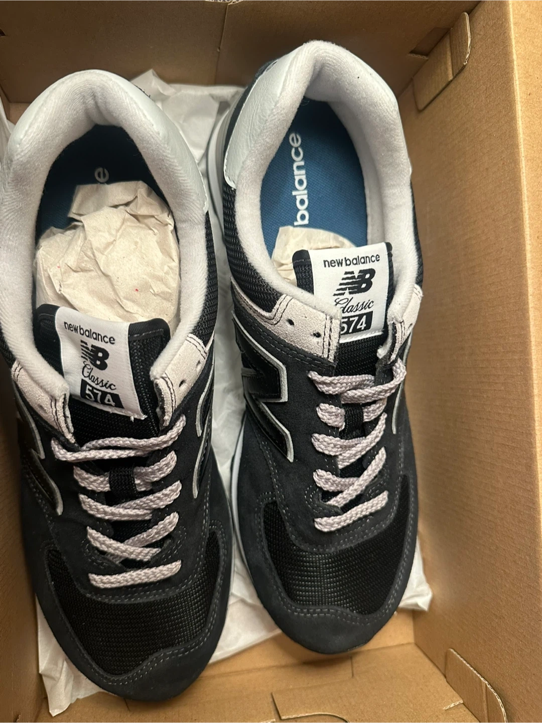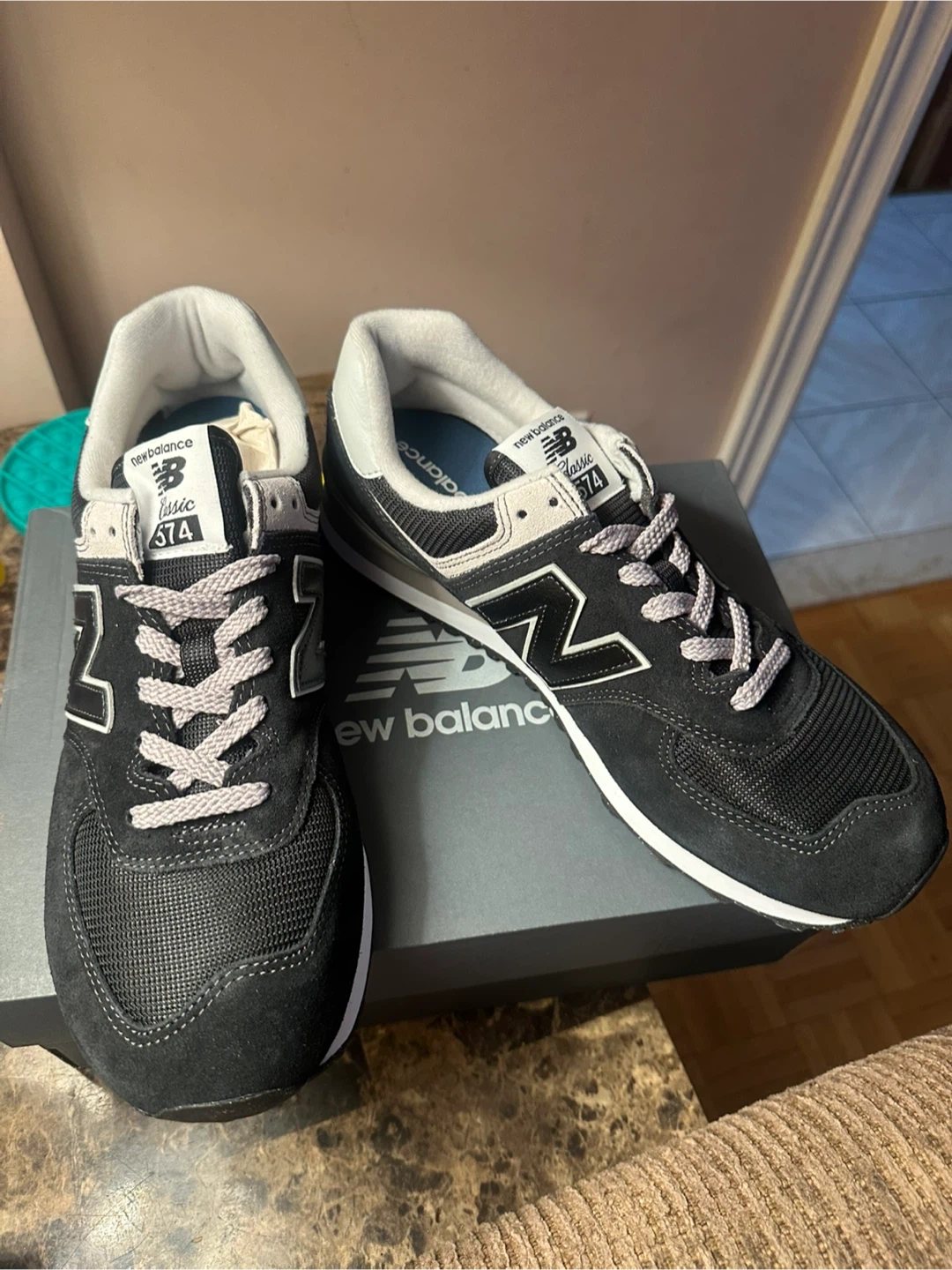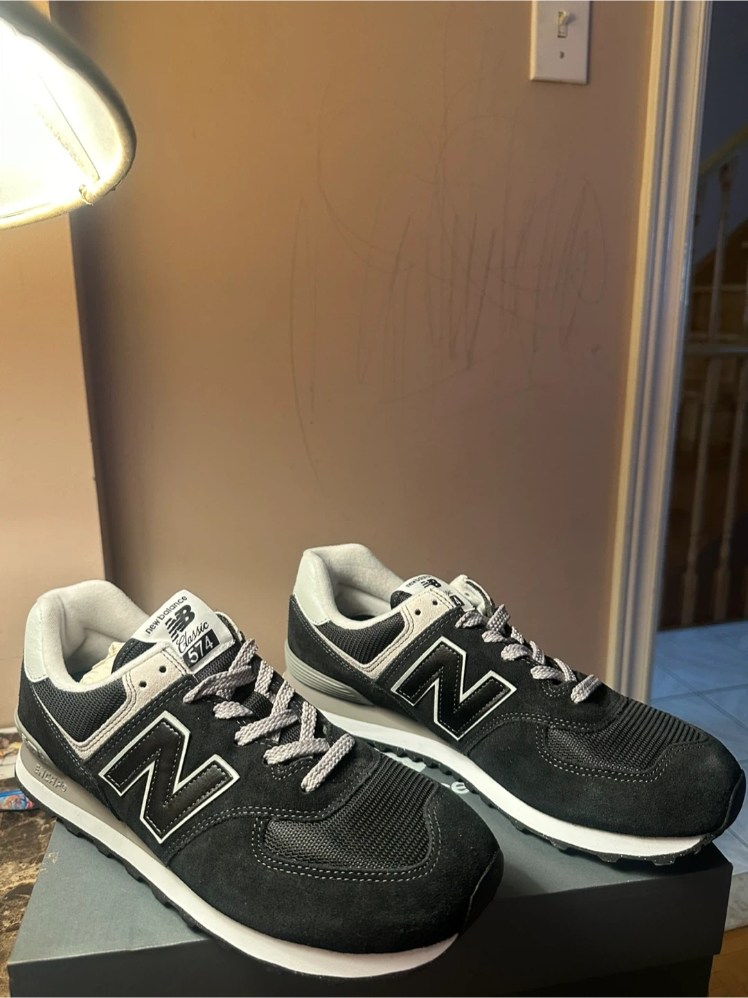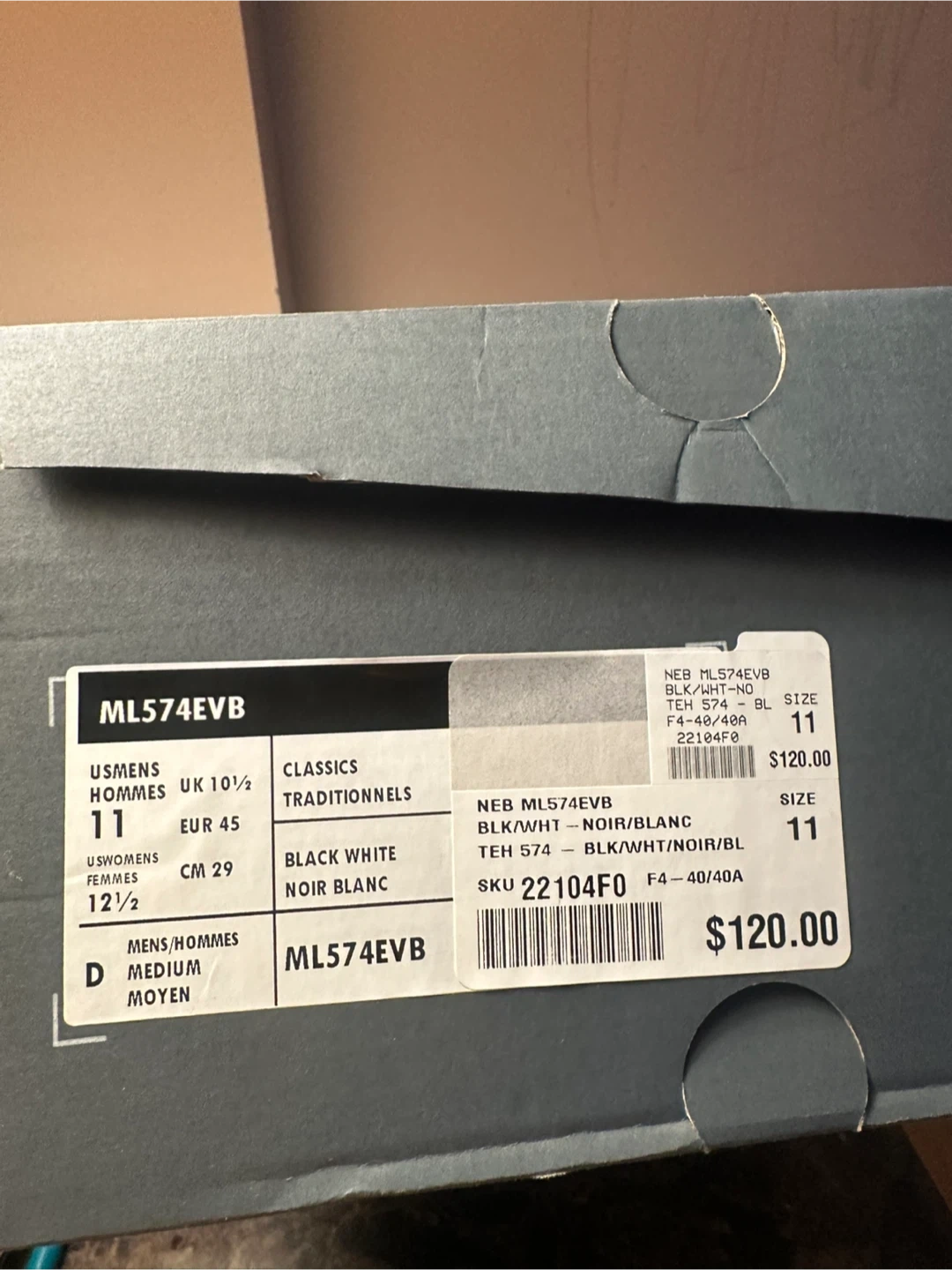Selling a pair of New Balance 574 Classic sneakers in black and white, size 11 US. They are new and come with the original box. A classic and comfortable shoe!