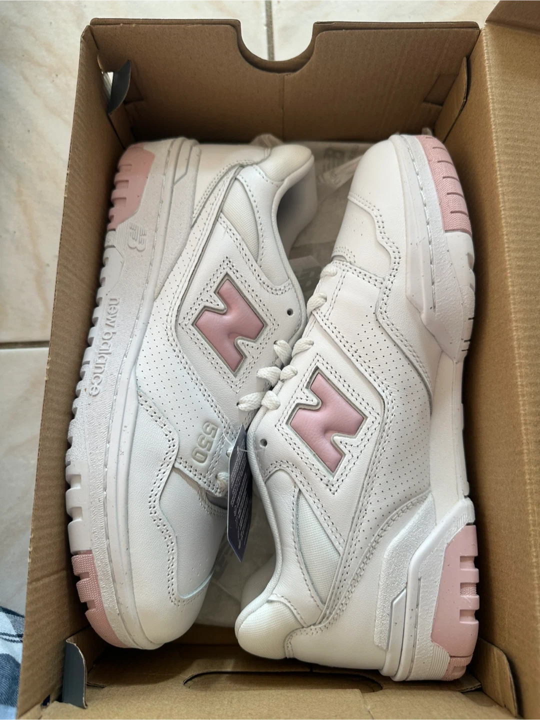 Selling a pair of New Balance 550 sneakers in white and pink! They're in new condition and come with the original box. These shoes feature Ortholite comfort foam insoles for extra cushioning and support. Perfect for adding a pop of colour to your everyday outfits!