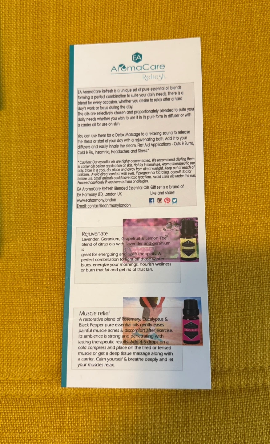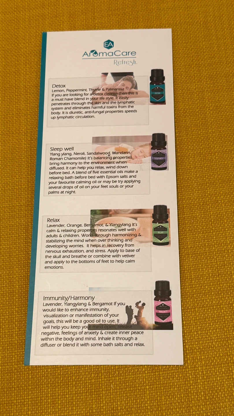 AromaCare Refresh Essential Oil Blends Set includes six different blends: Detox, Sleep Well, Relax, Immunity/Harmony, Muscle Relief, and Rejuvenate. Each blend contains a unique combination of essential oils designed to promote well-being and relaxation. The box is included! PLEASE NOTE: Pickup in Tuscany area or meetup up at Market Mall. Price is firm. Cash only. Please send me a message with date/time to pickup.
