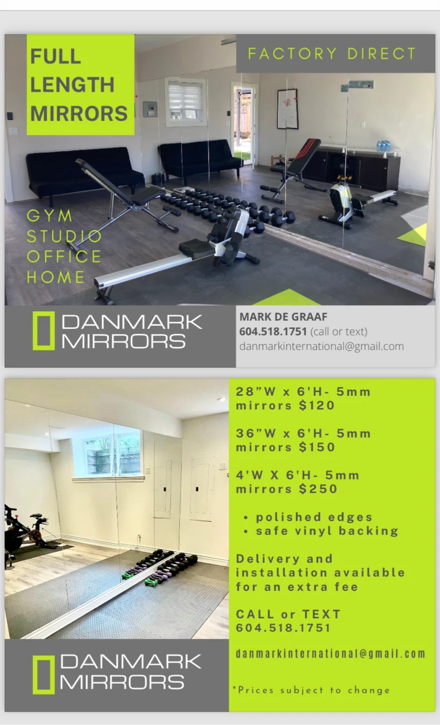 Gym mirrors - Frameless -Full height 28" x 72"- $120.00 (Brand new) 36" x 72"- $150.00 ( Brand new) 5mm thick. New wider 48" x 72" - $250.00 ( Brand New) 5mm , great for commercial applications. All mirrors comes with vinyl safety film backing and polished edges. Just received a large order. 100's in stock fresh out of the crate. Also available: mirror clips. $5 for a pack of 4 or for multiples mirror installations J- channel a continuous track for along the bottom. Easy to transport, Handle, and install. Strong enough to be leaned on the wall. Delivery and installation is an option for an extra fee. Please DM me for more information. ON THE ISLAND? Or from the INTERIOR?.....WE HAVE LOCAL INVENTORY, DELIVERY, AND INSTALLATION SERVICES AVAILABLE. Please send a DM for local contact info.