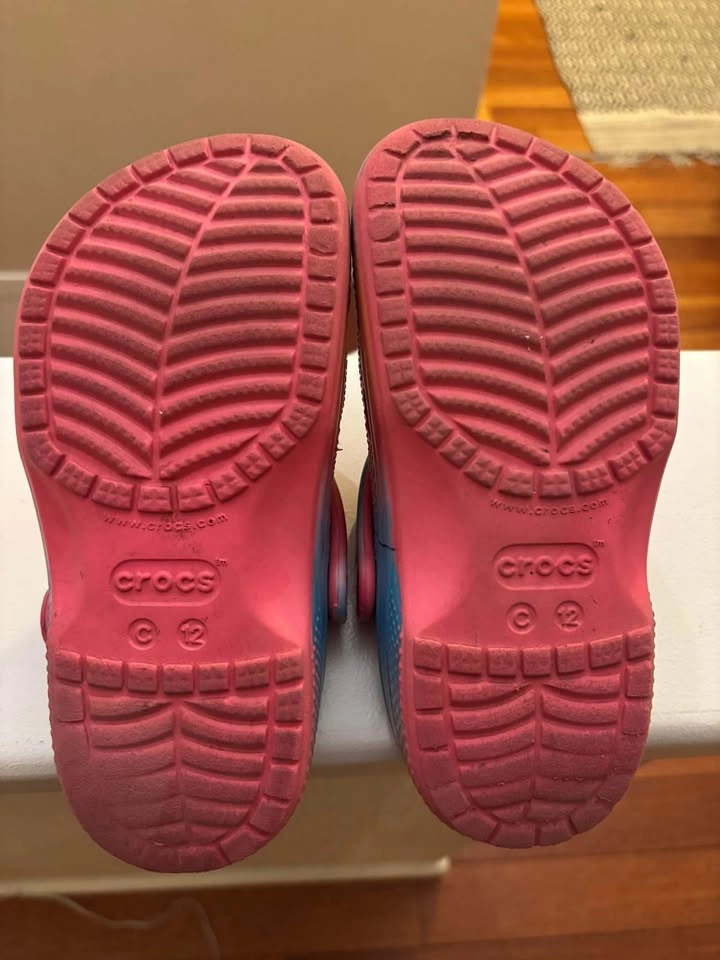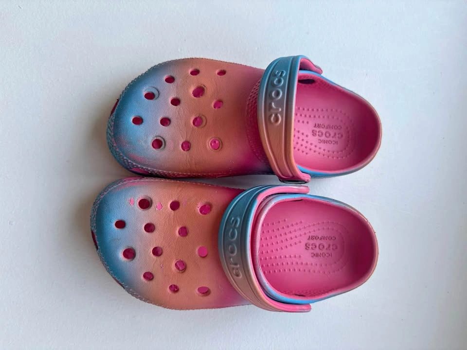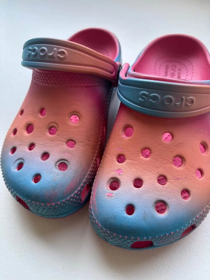 There are marks from removed Jibbitz charms and some area with scuffing/peeling.