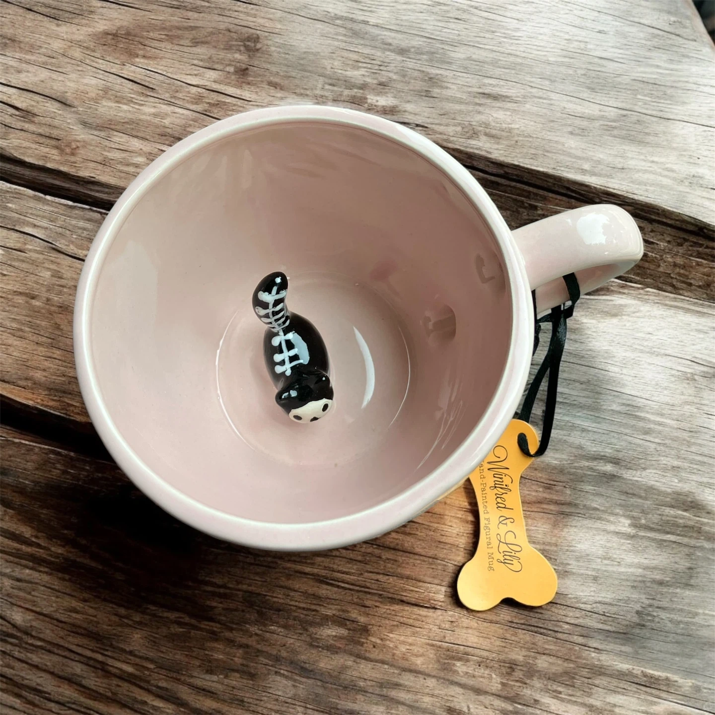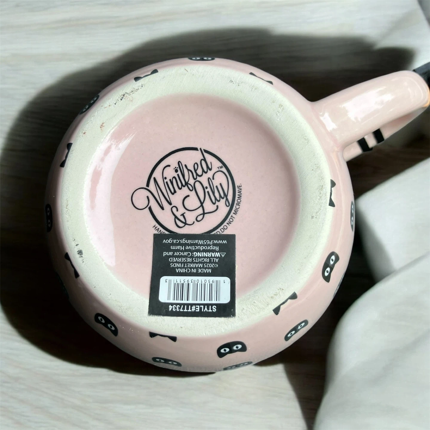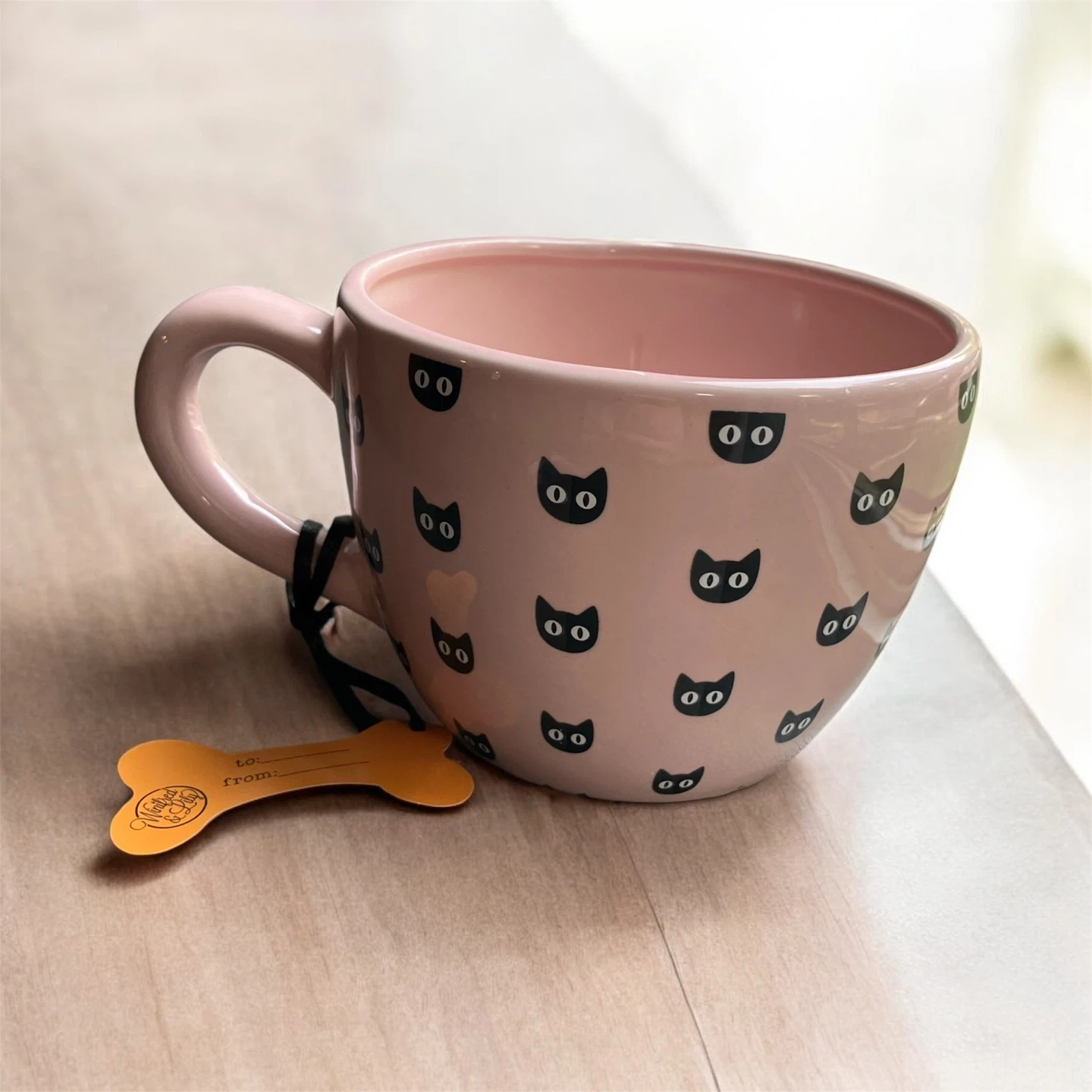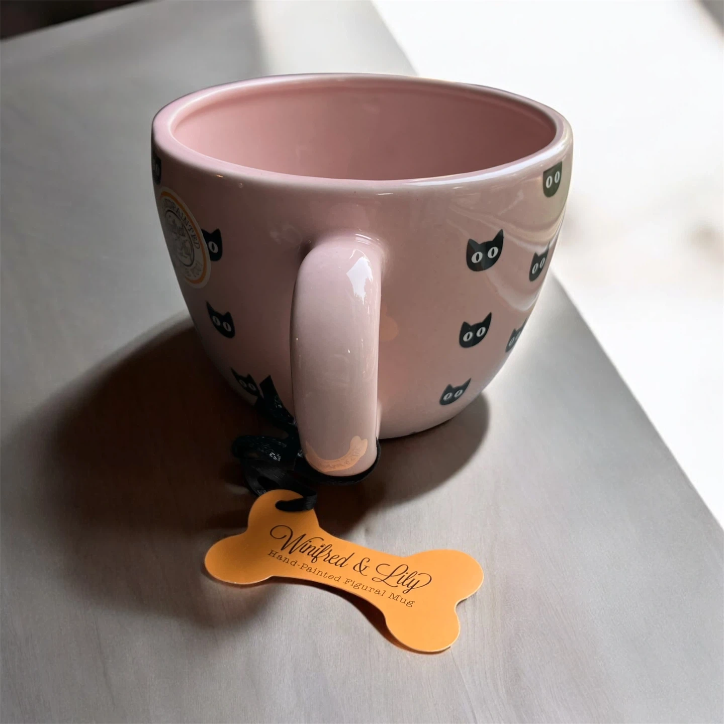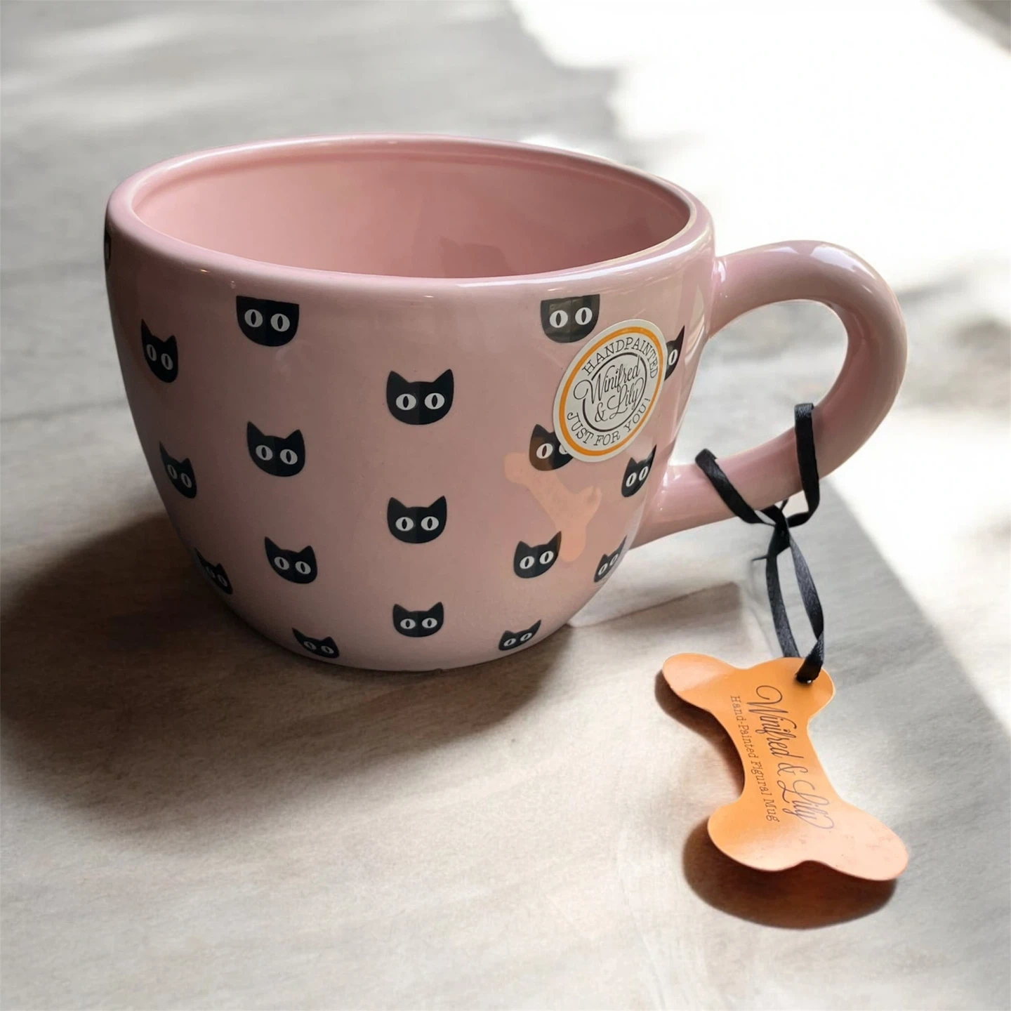 NWT Winifred & Lily hand painted figural oversized pink mug featuring all over black cat heads and a black and white cat figure inside the mug. This mug is perfect for Halloween and cat lovers alike! Measures approximately 3.75" H x 4.75" D I ship using recycled material within my home to reduce waste. The package will be wrapped with care if requested