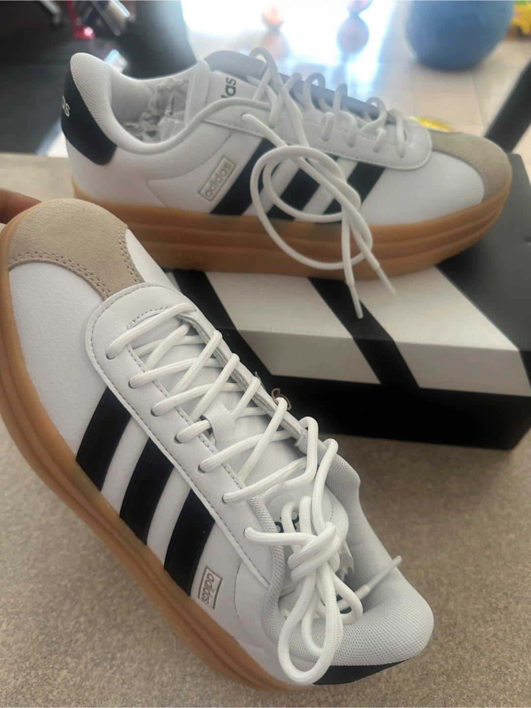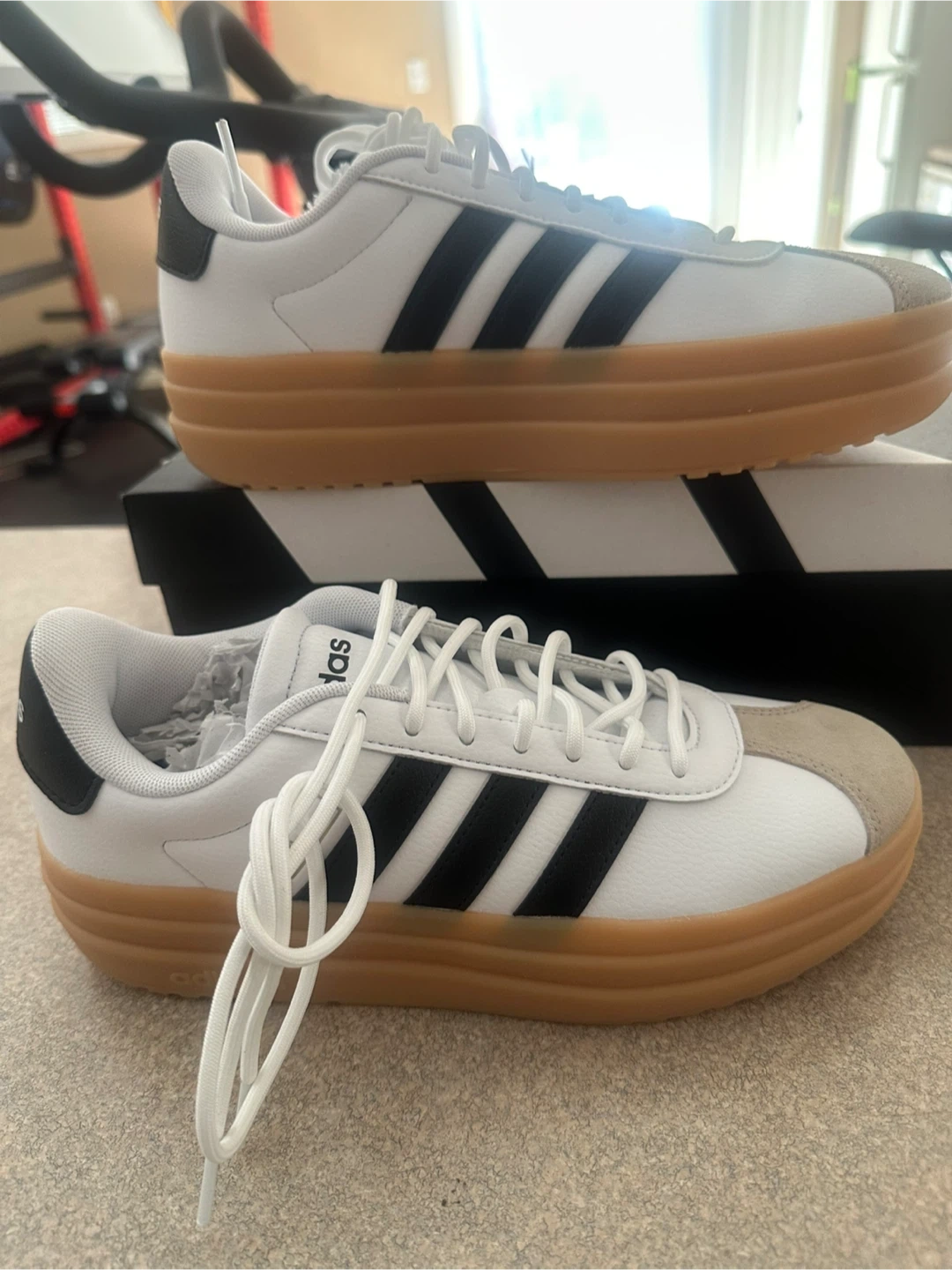 These Adidas Court Platform shoes are in great condition and ready for a new home! They feature the classic Adidas three-stripe design in black against a clean white background, with a stylish gum-coloured platform sole. Perfect for adding a bit of height and style to your everyday look!