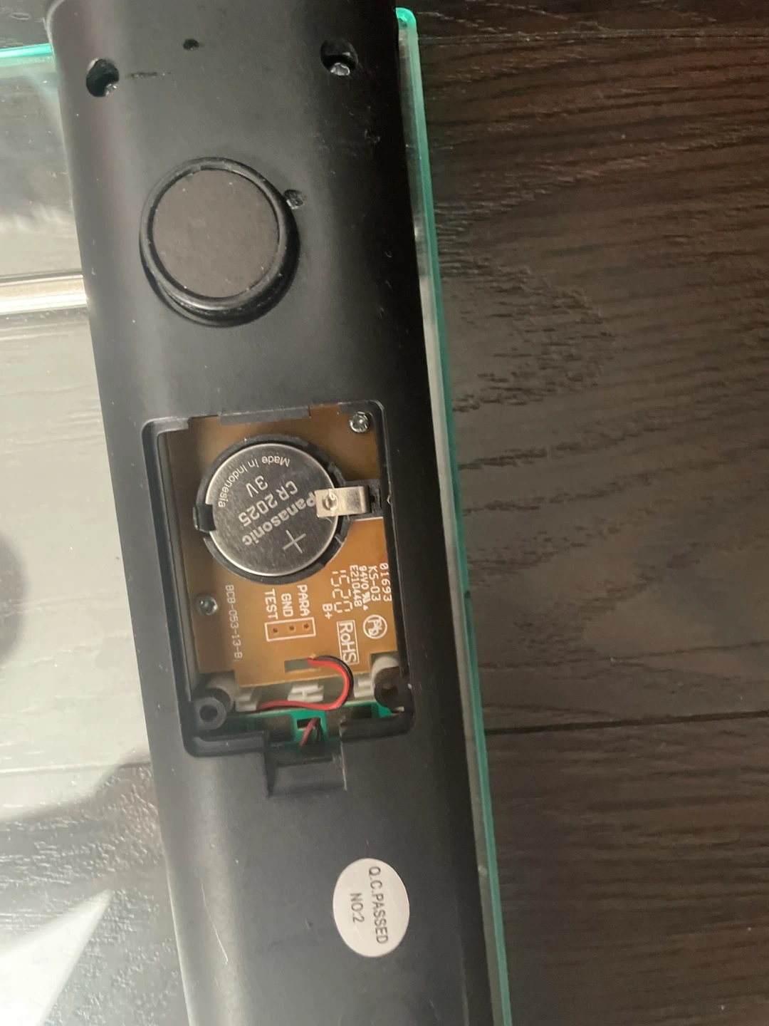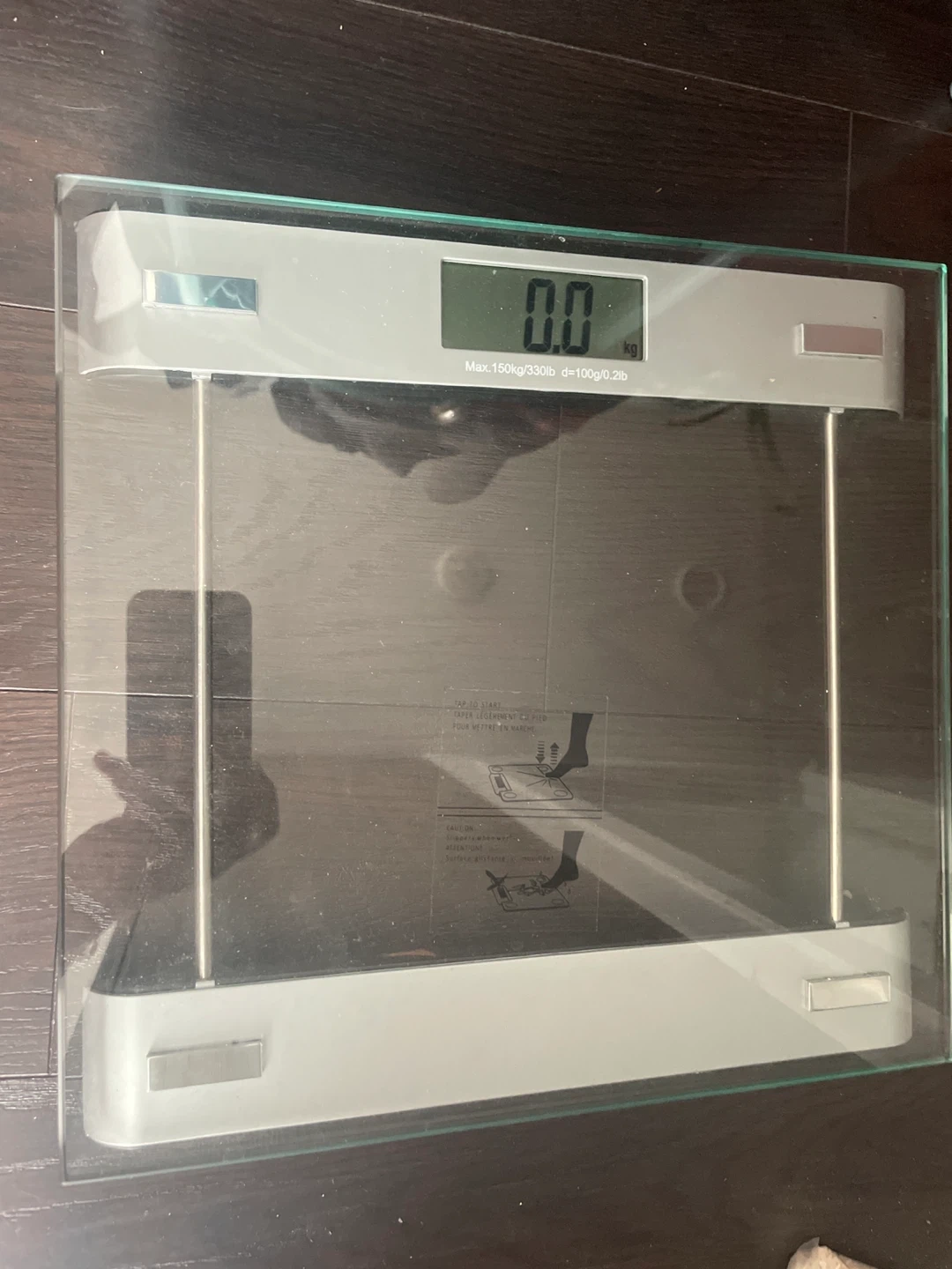 Digital bathroom scale with a glass top. It can measure up to 150kg/330lb with a precision of d=100g/0.2lb. It uses a CR2025 3V battery.