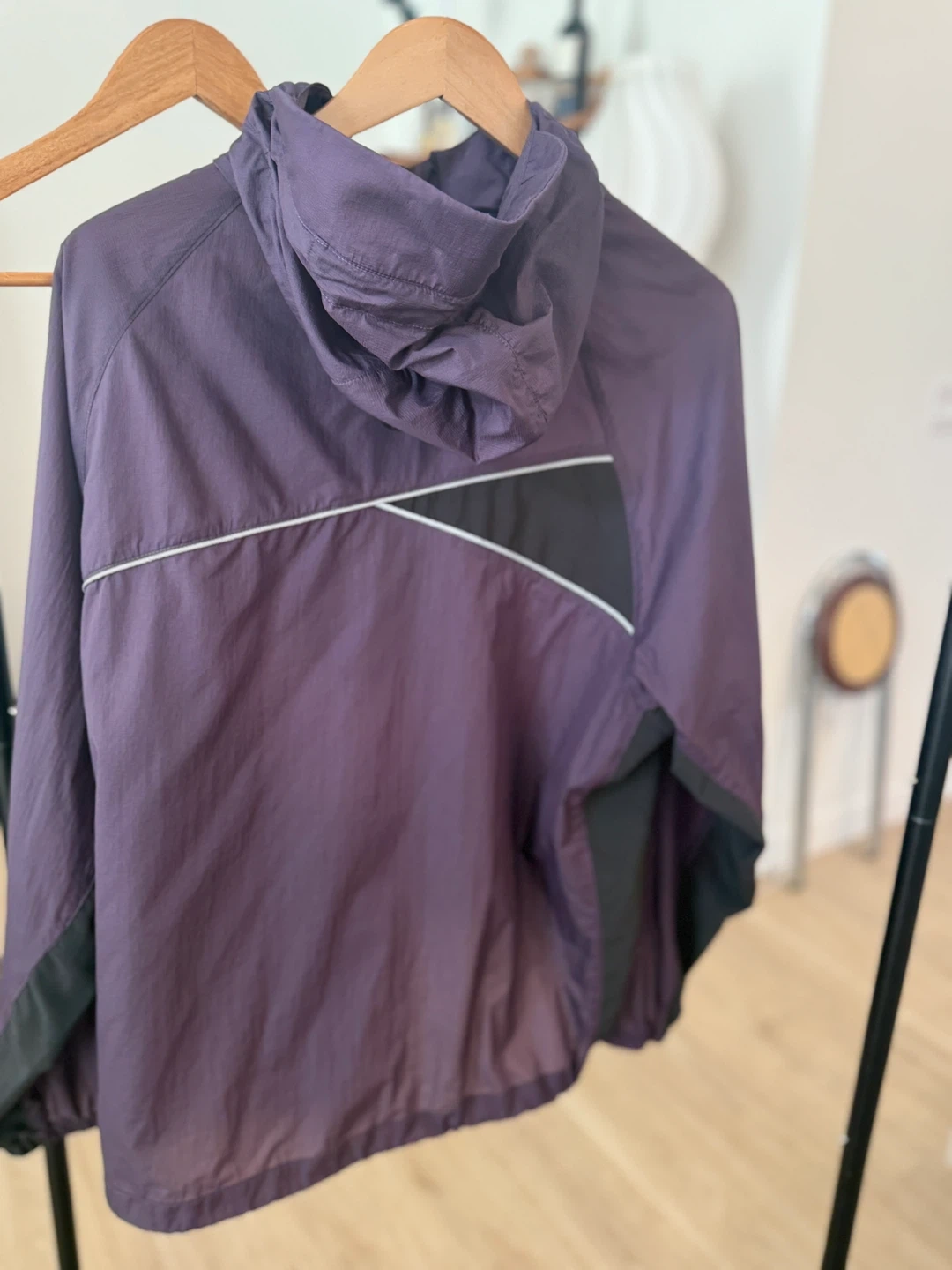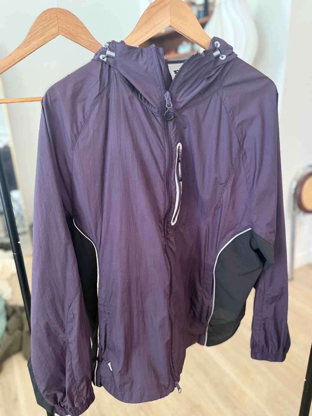 Selling a gently used purple windbreaker jacket. It's lightweight and perfect for outdoor activities. The jacket features a hood and a zipper closure, making it a practical choice for unpredictable weather. It's in great condition and ready for a new home