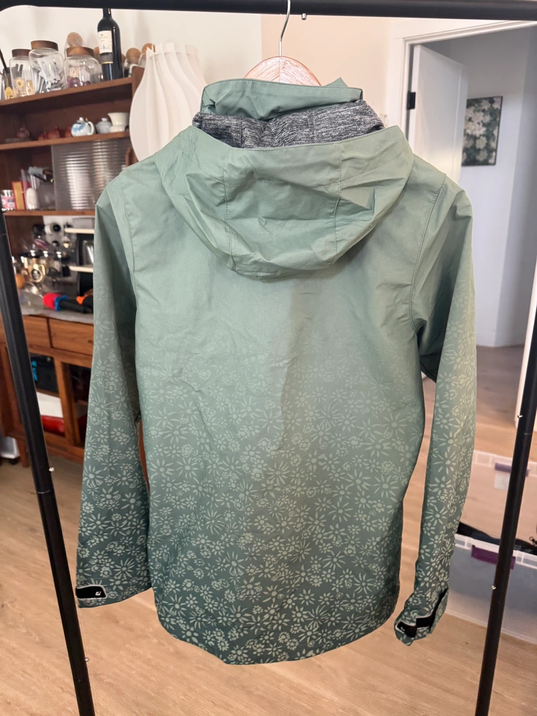Selling a women's waterproof jacket from O'Neill! It's a lovely sage green colour with a subtle floral pattern fading from the bottom up. Perfect for light rain and wind, and great for layering