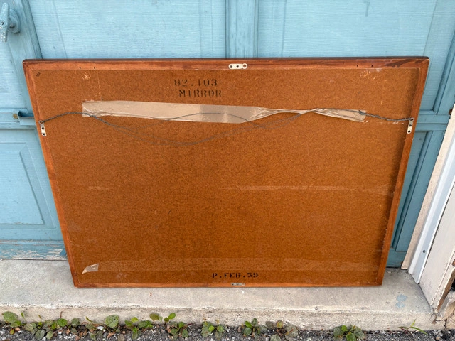 This is a large vintage mirror with a lovely wood frame, perfect for adding character to any room. It is used and has some minor wear consistent with its age, which adds to its vintage charm. The mirror measures approximately 42 inches wide by 30 inches tall. It is ready to hang and become a focal point in your home. Weighs about 45 lbs.
