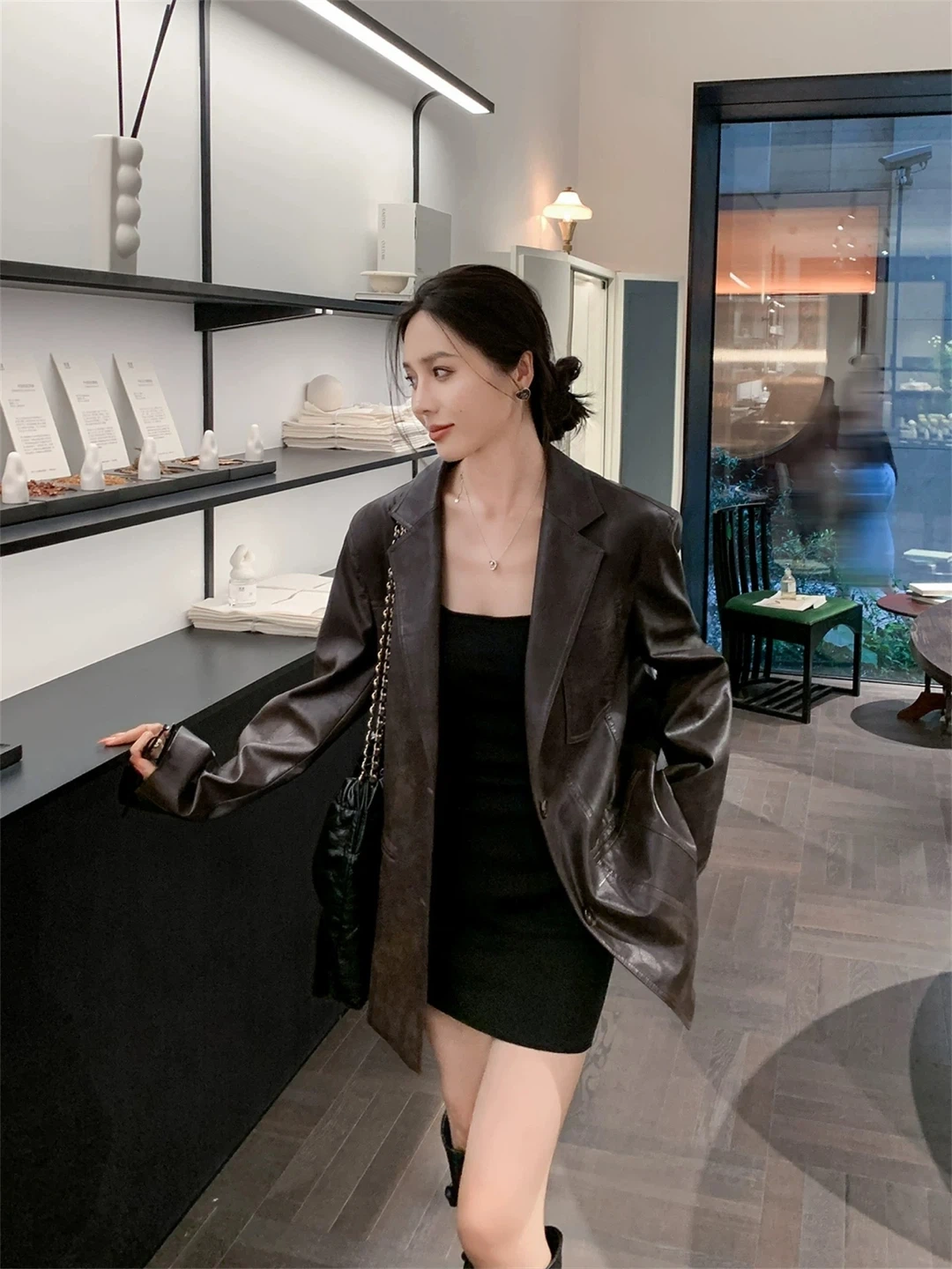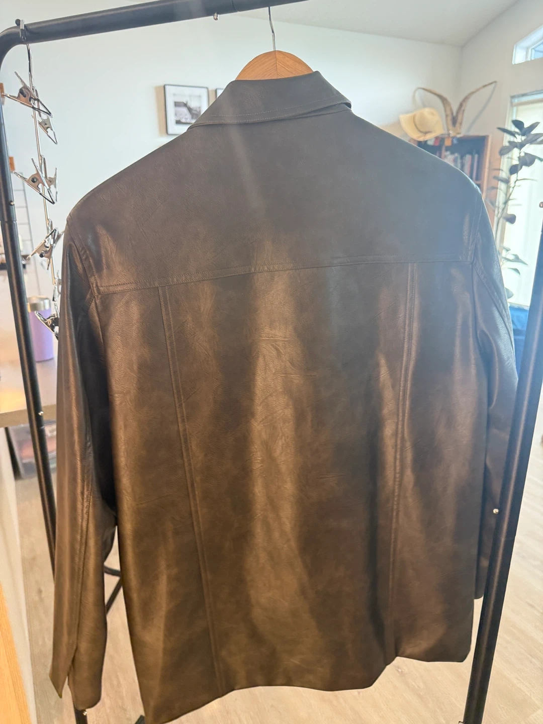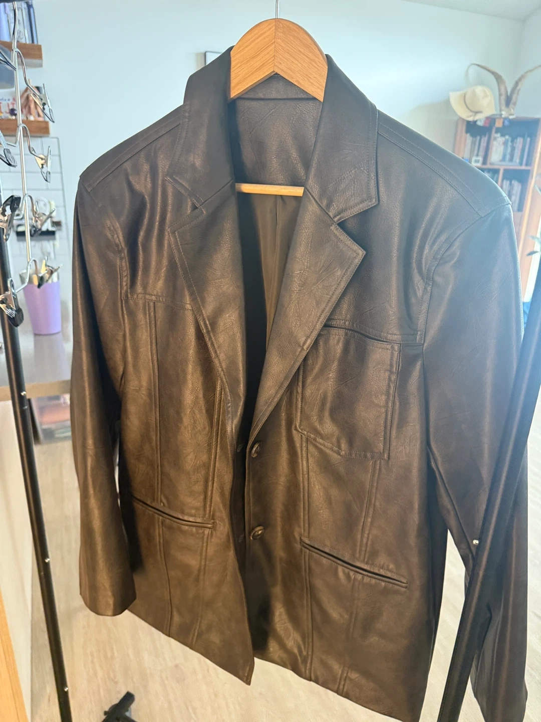 Selling a stylish brown leather blazer. It's in great condition and ready for a new home! The blazer is perfect for adding a touch of sophistication to any outfit. It features a classic design with a button closure and functional pockets. A versatile piece for your wardrobe