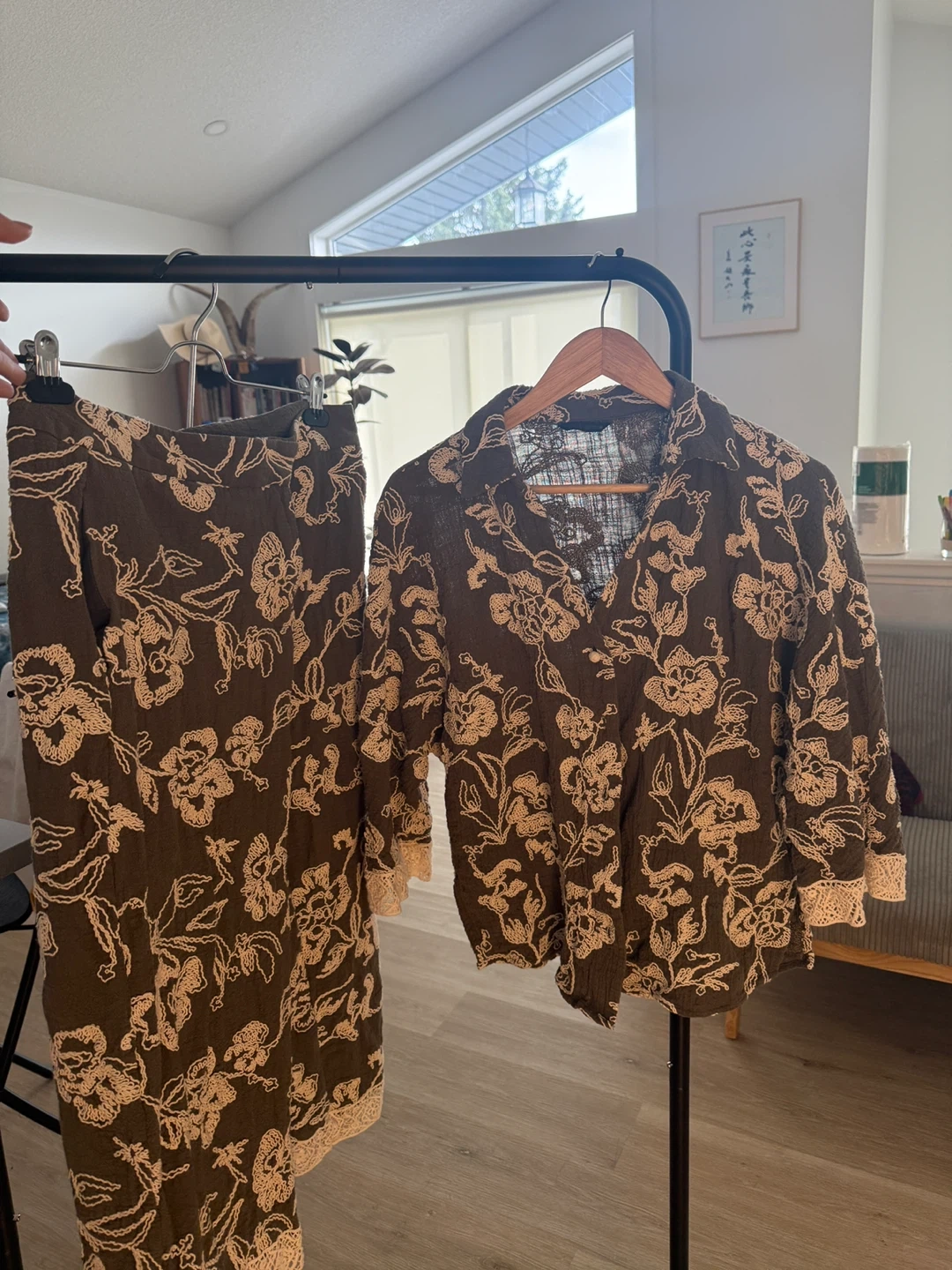 Selling a unique floral two-piece set! The set includes a button-up shirt and matching skirt. The material has a lovely texture and the floral pattern is really eye-catching. Perfect for a special occasion or to add a bit of flair to your everyday wardrobe