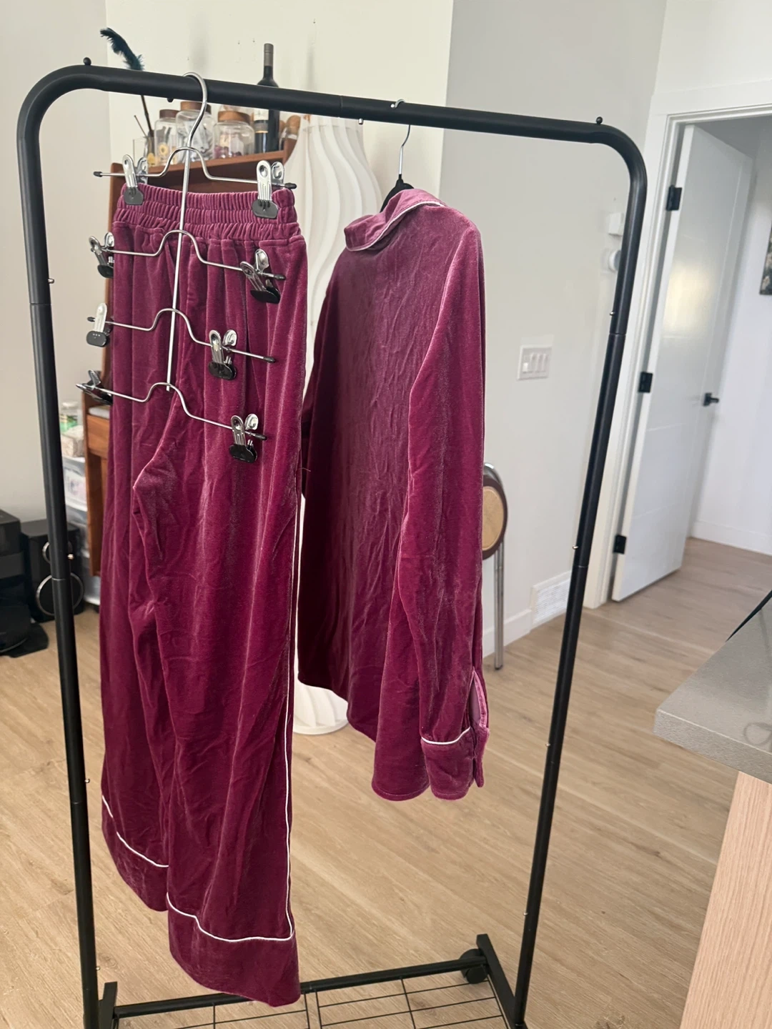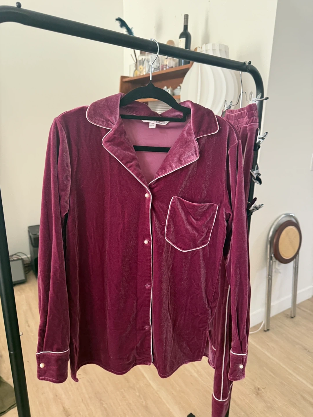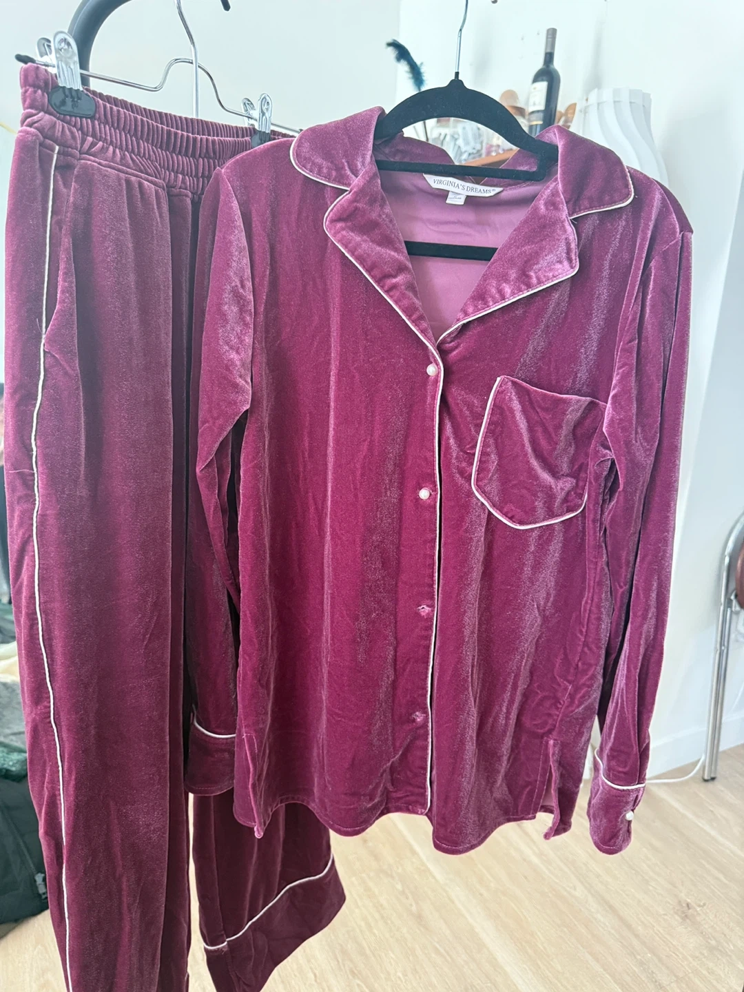 Selling a beautiful velvet pajama set from Victoria's Dreams! The set includes a long-sleeved, button-down top with a pocket and matching pants with an elastic waistband. The rich, deep colour and soft velvet material make it perfect for a cozy night in. It's in great condition and ready for a new home!