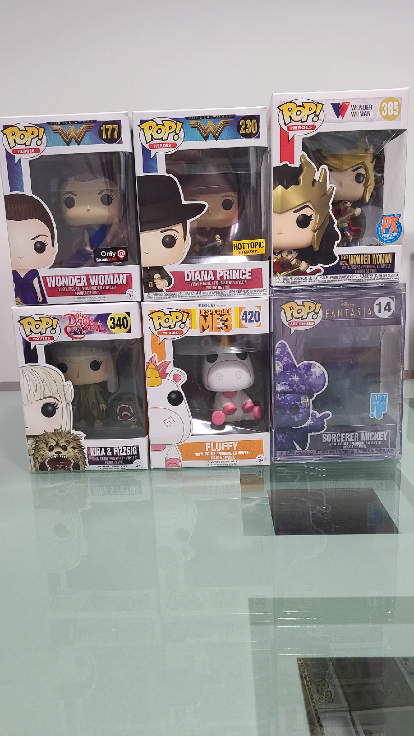 Selling a collection of Funko Pop! vinyl figures. Included are: - Wonder Woman #177 (GameStop Exclusive) - Diana Prince #230 (Hot Topic Exclusive) - Wonder Woman #385 - Kira & Fizzgig #340 (The Dark Crystal) - Fluffy #420 (Despicable Me 3) - Sorcerer Mickey #14 (Fantasia Art Series)