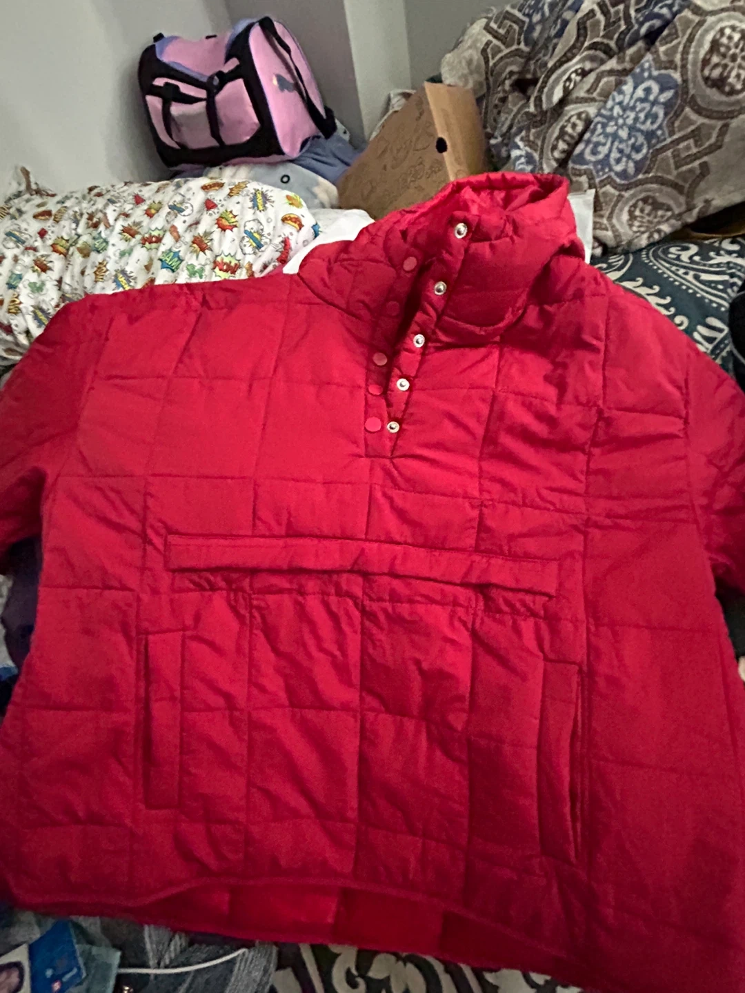 Selling a red quilted pullover jacket. It's in great condition and ready for a new home! The jacket features a button-up collar and a front pocket.
