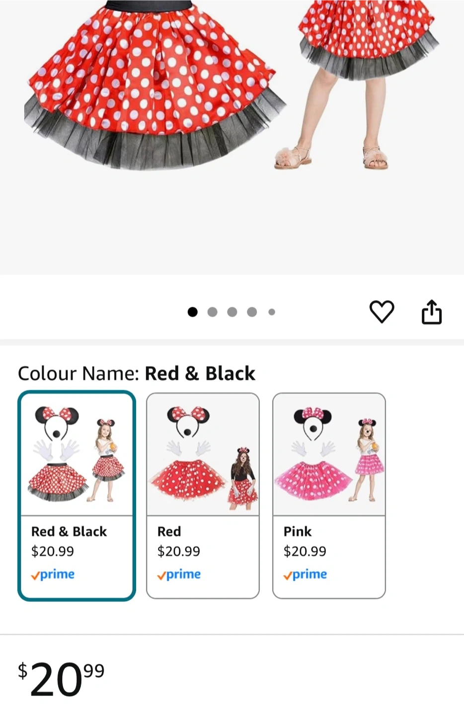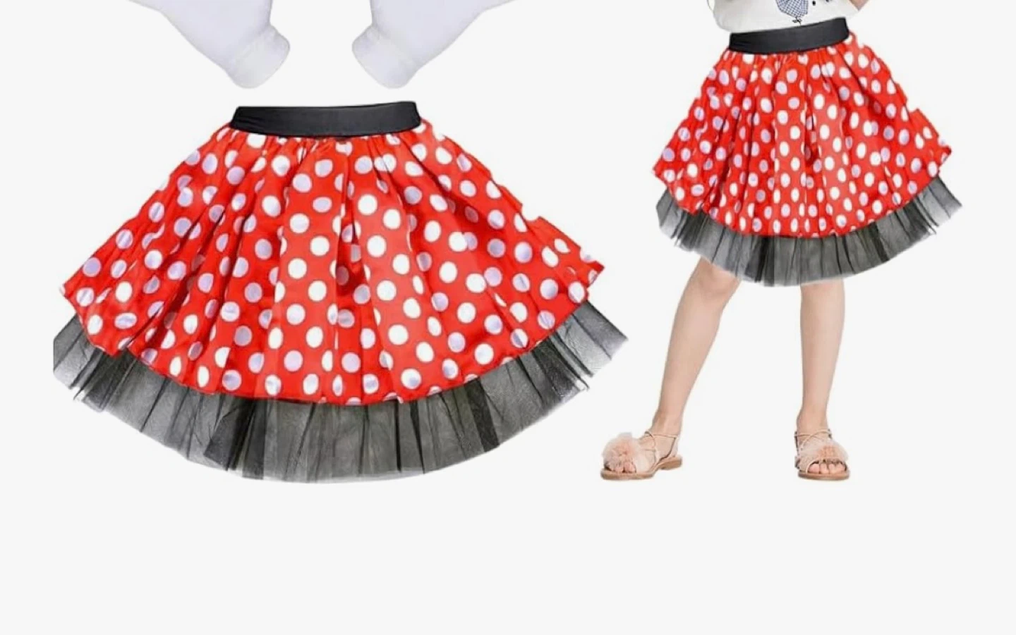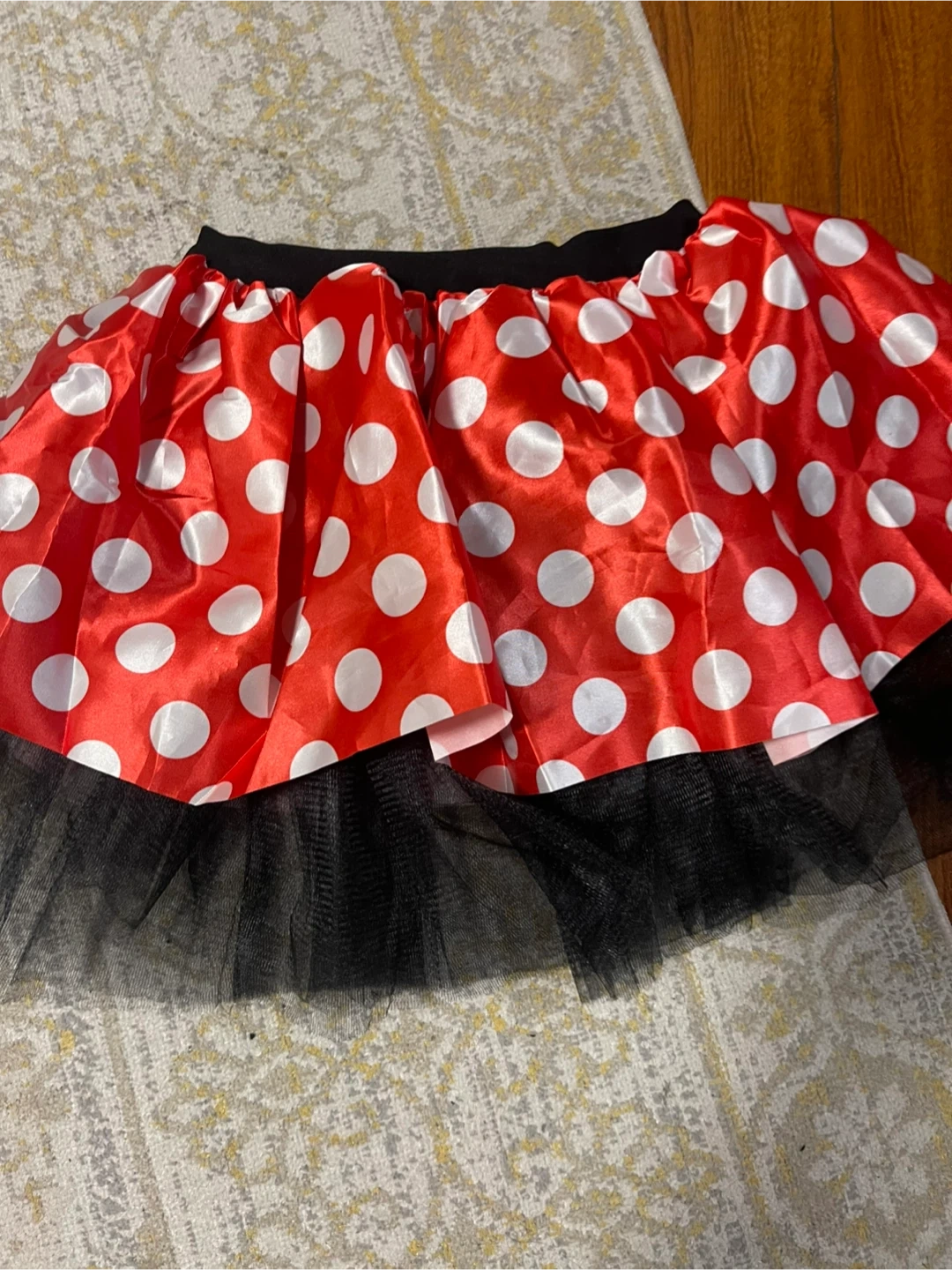 This adorable Minnie Mouse skirt is perfect for dress-up or a costume party! It features a red and white polka dot pattern with a black tulle trim. The skirt is in great condition and ready for a new home!