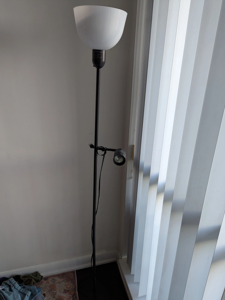 Selling a black floor lamp with a spotlight feature! It's in great condition (main bulb and spot light bulbs are in working condition) and would be perfect for adding some extra light to any room. Height - 6ft