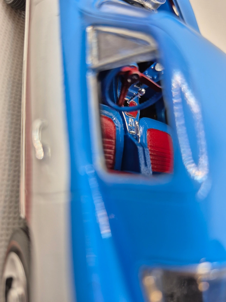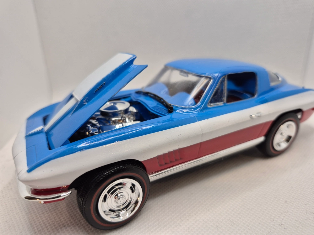 Selling a plastic model of a Chevrolet Corvette Sting Ray. It's a really cool replica with a blue, white, and red colour scheme. The hood opens up to reveal the engine details, and the interior is nicely detailed as well. It would look great on a shelf or desk!
