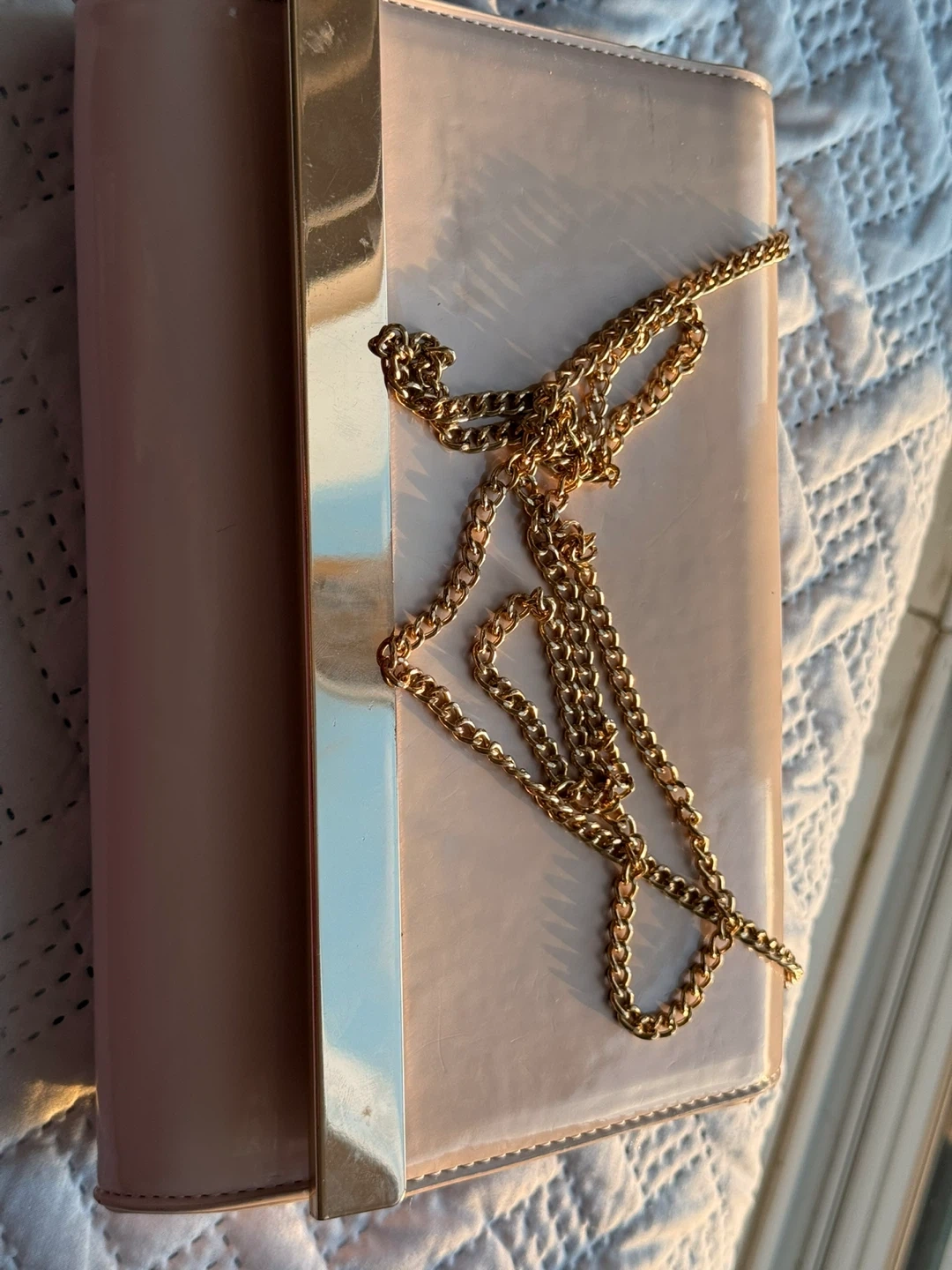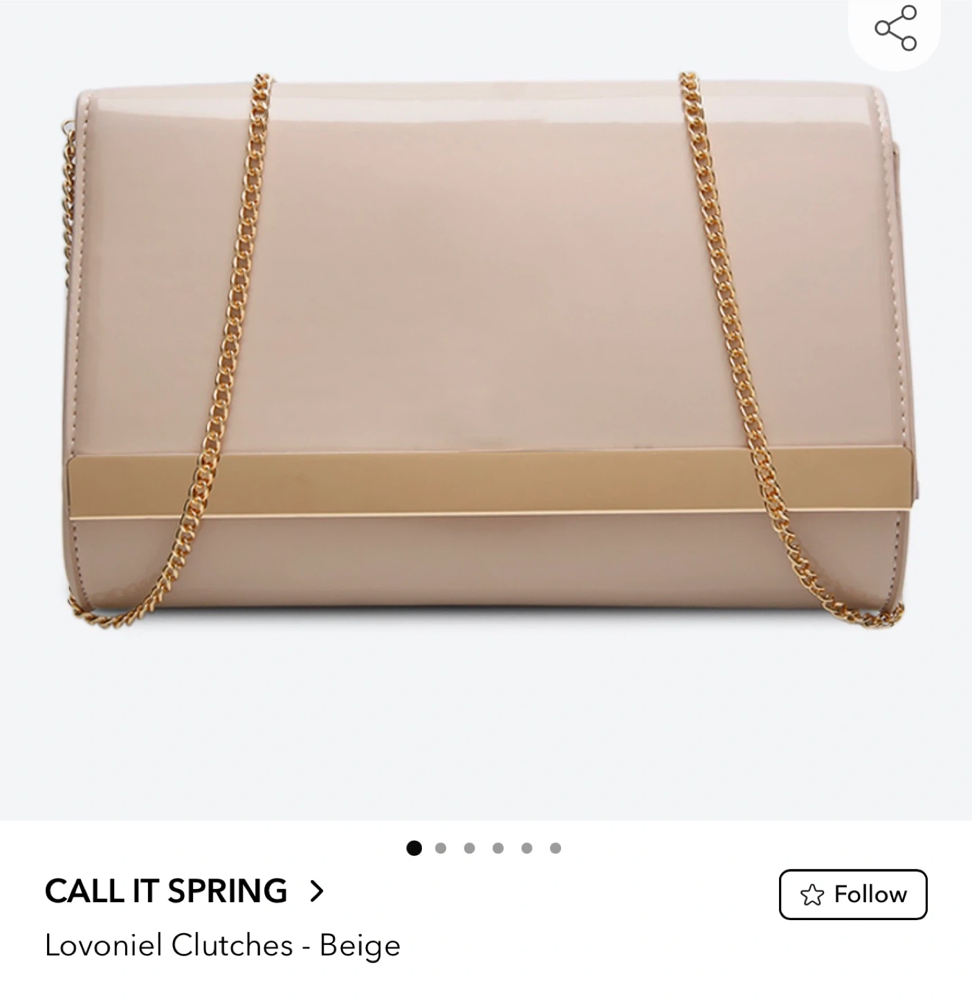 Selling a Call It Spring Lovoniel clutch in beige! It has a gold chain and a shiny finish. It's perfect for evenings out or special occasions. The clutch is in great condition and ready for a new home!used once As Is