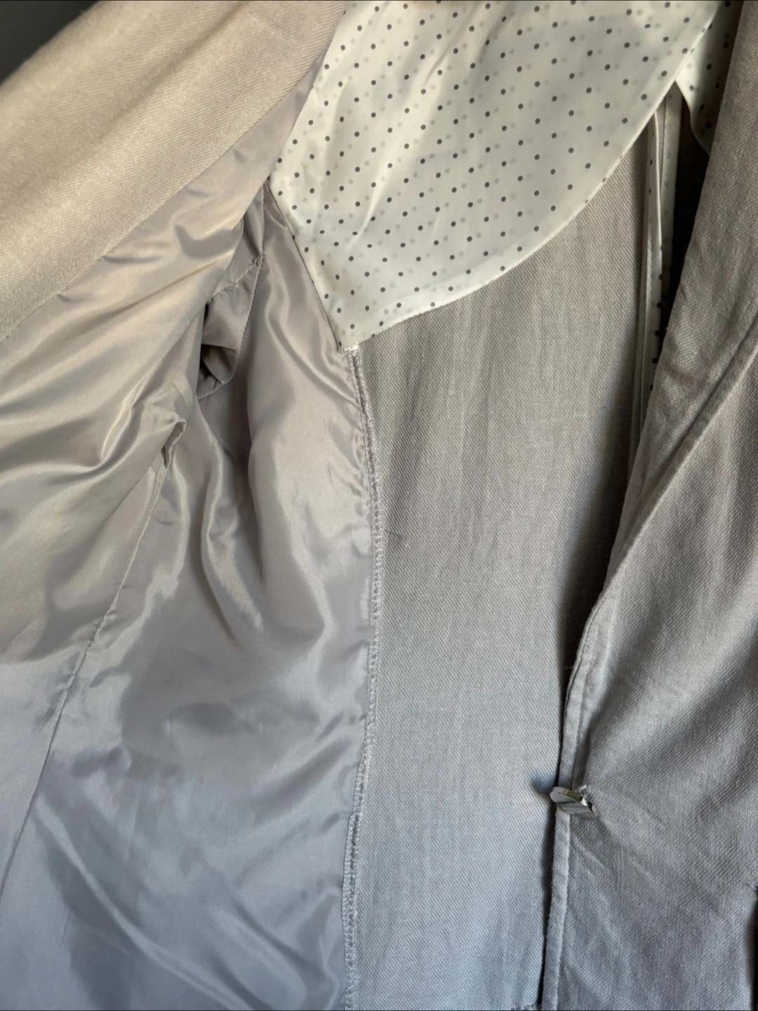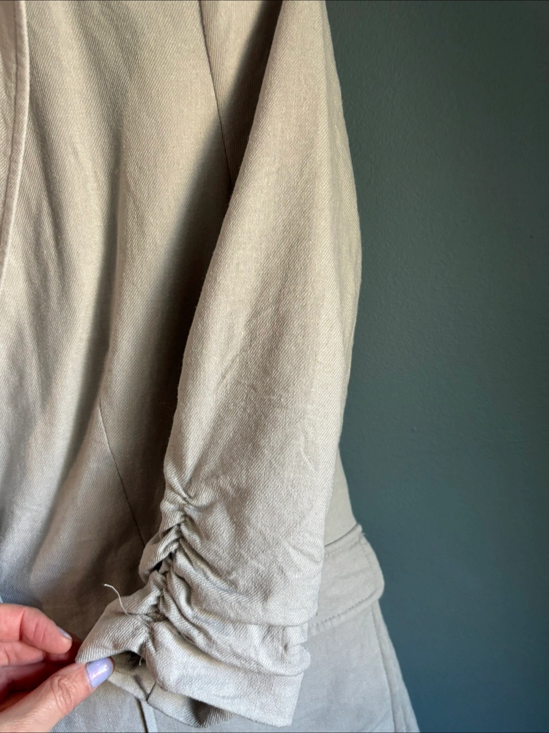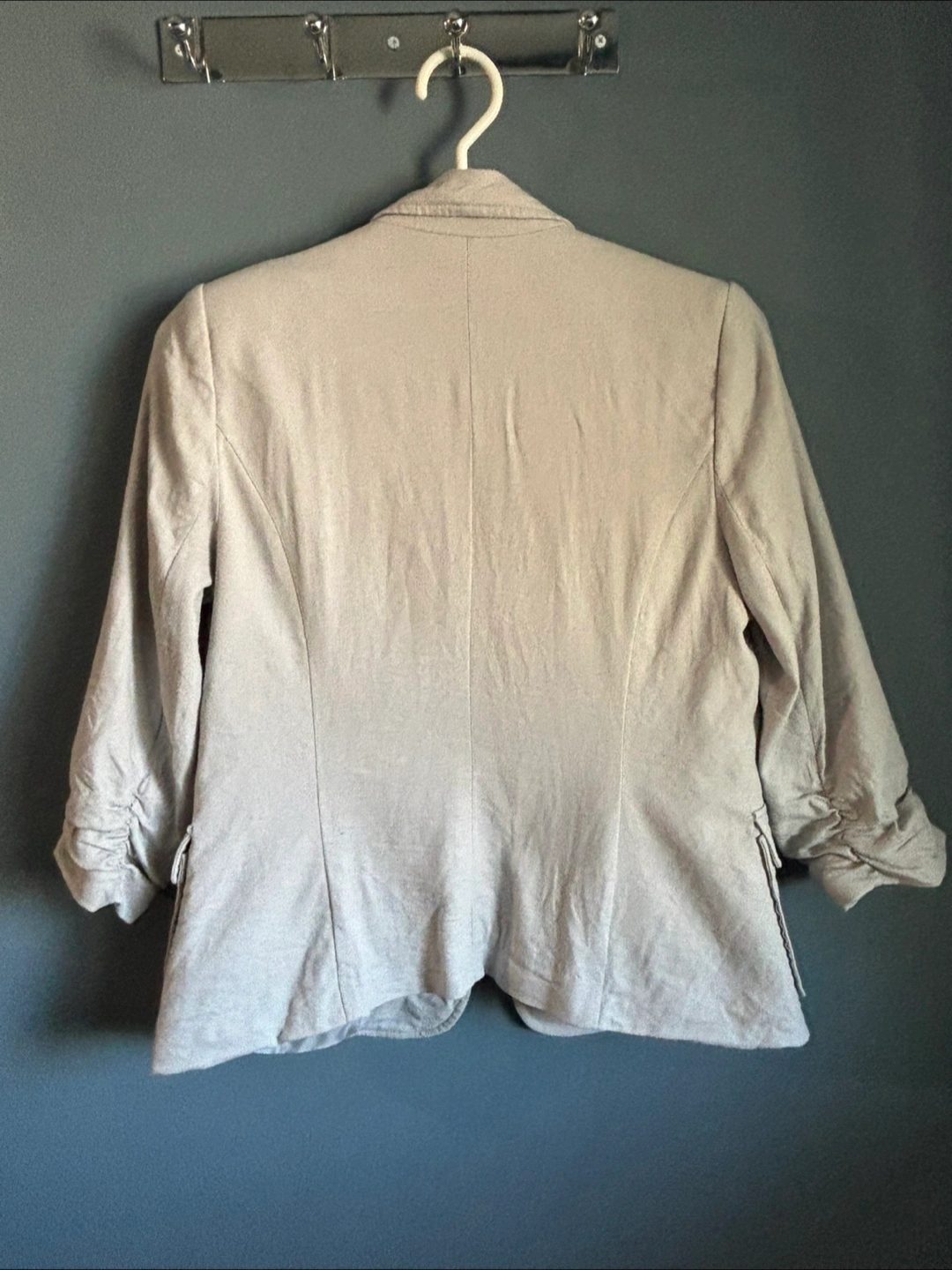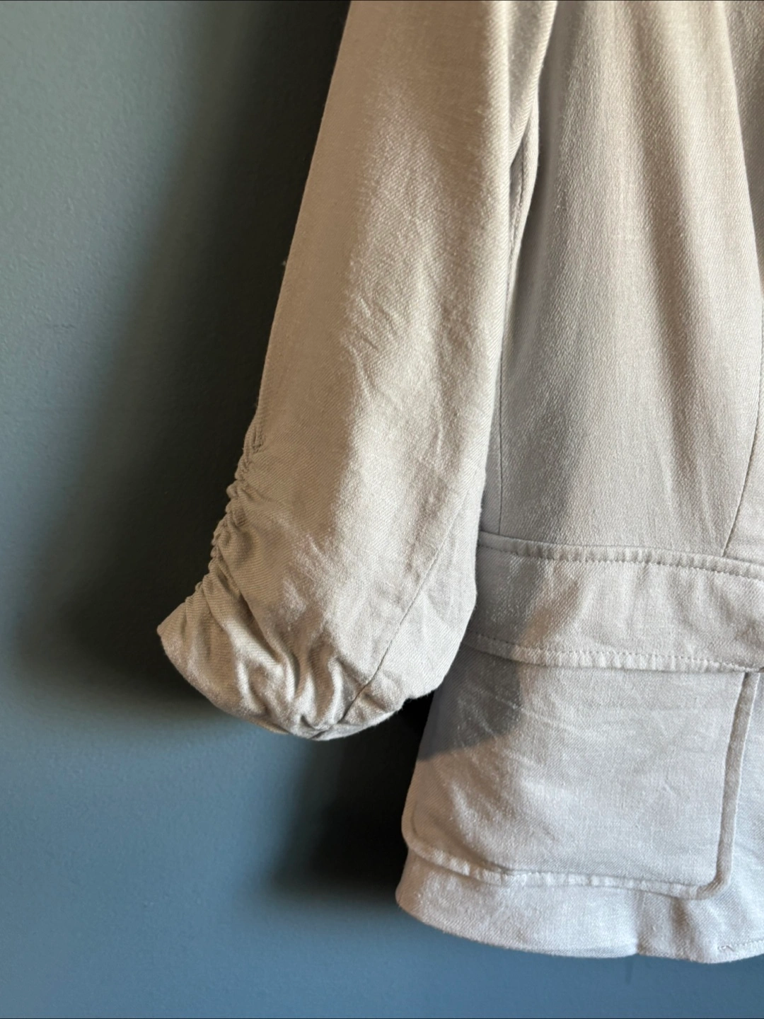 Selling a gently used Saks Fifth Avenue blazer! It's a beige colour and features a unique ruched sleeve detail. Perfect for adding a touch of sophistication to any outfit