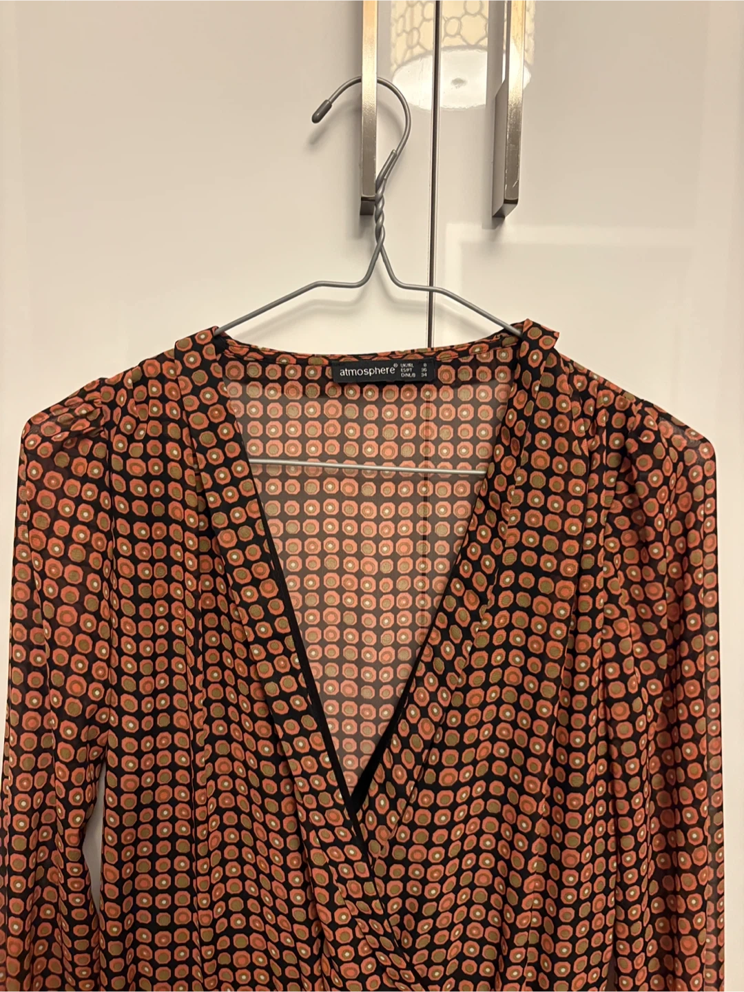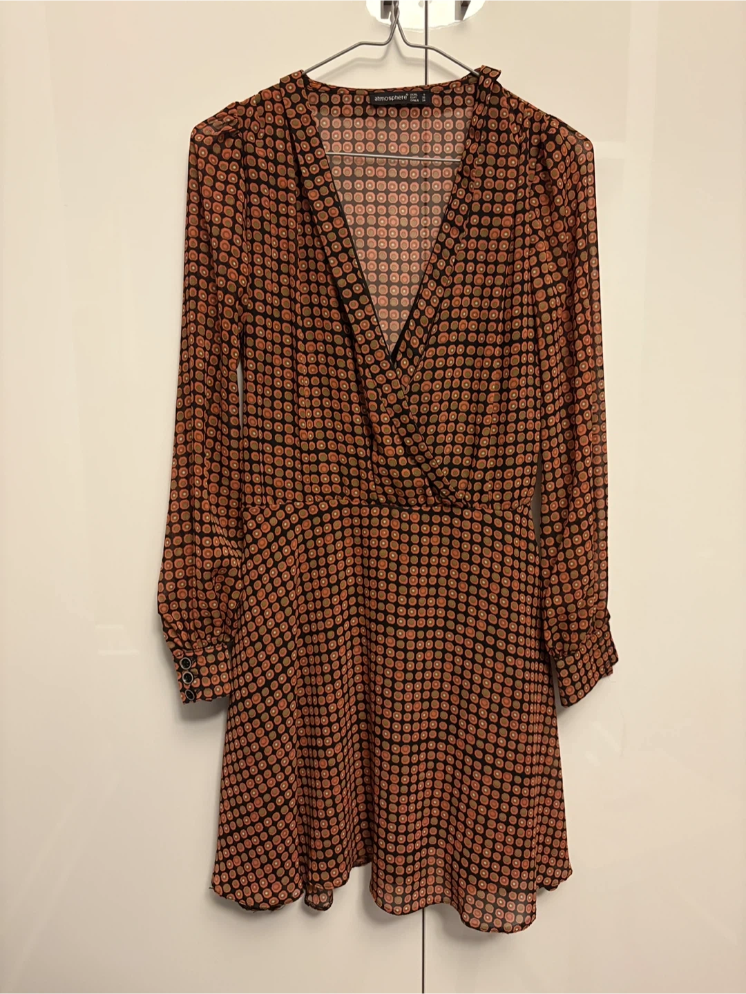 Selling a cute Atmosphere mini dress with a fun pattern! It's a size 8 (fits small) and in great condition. Perfect for a night out or a casual day.
