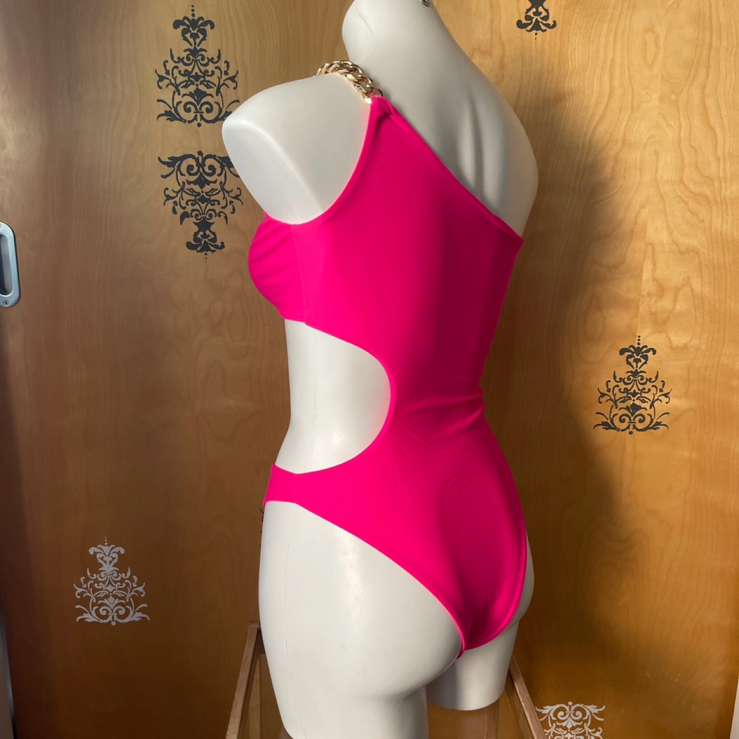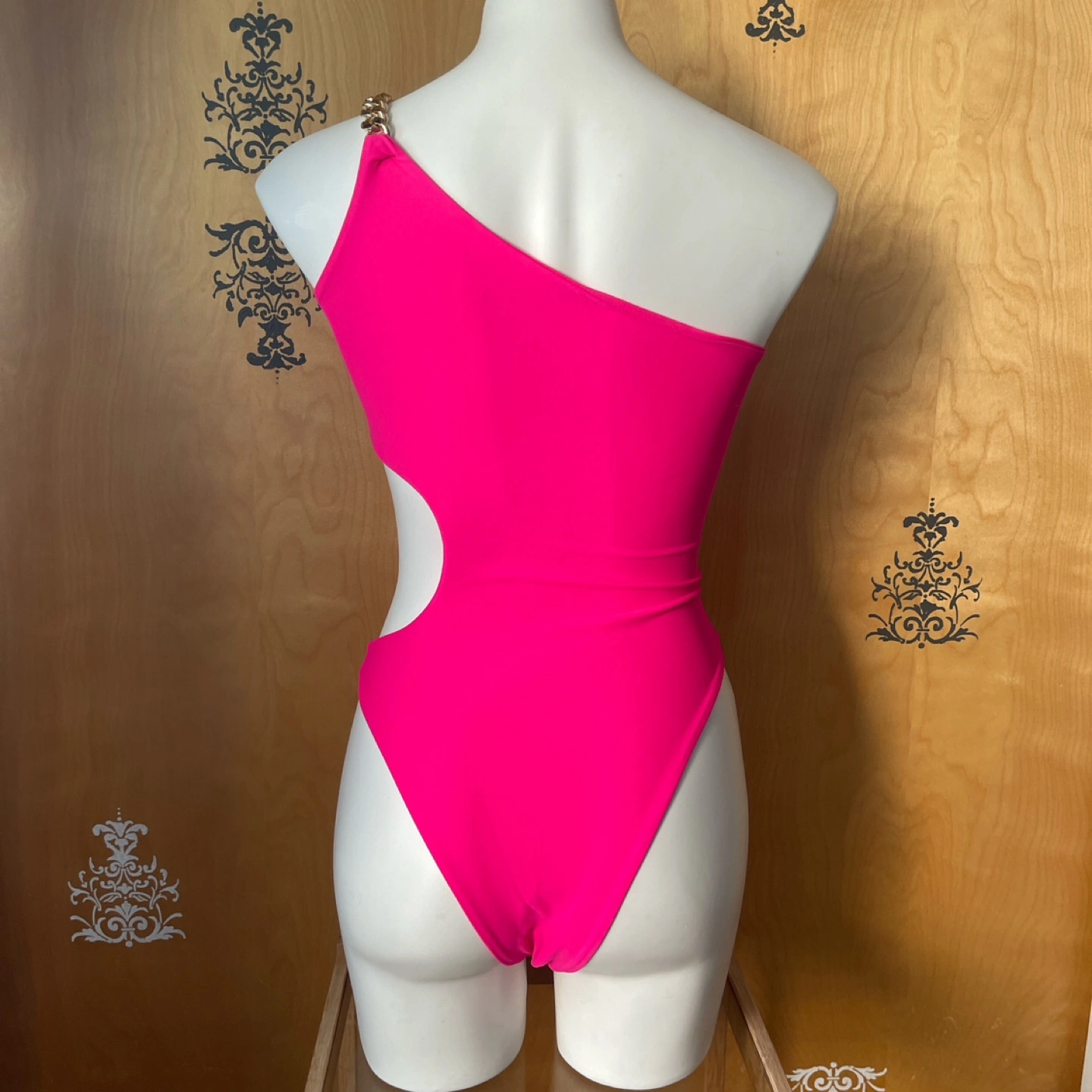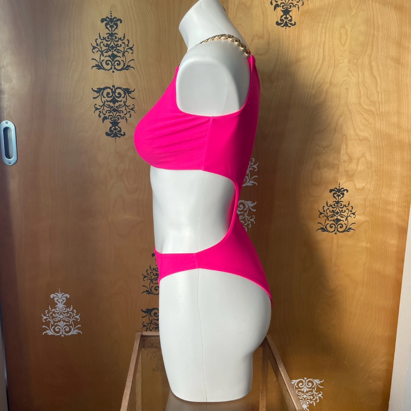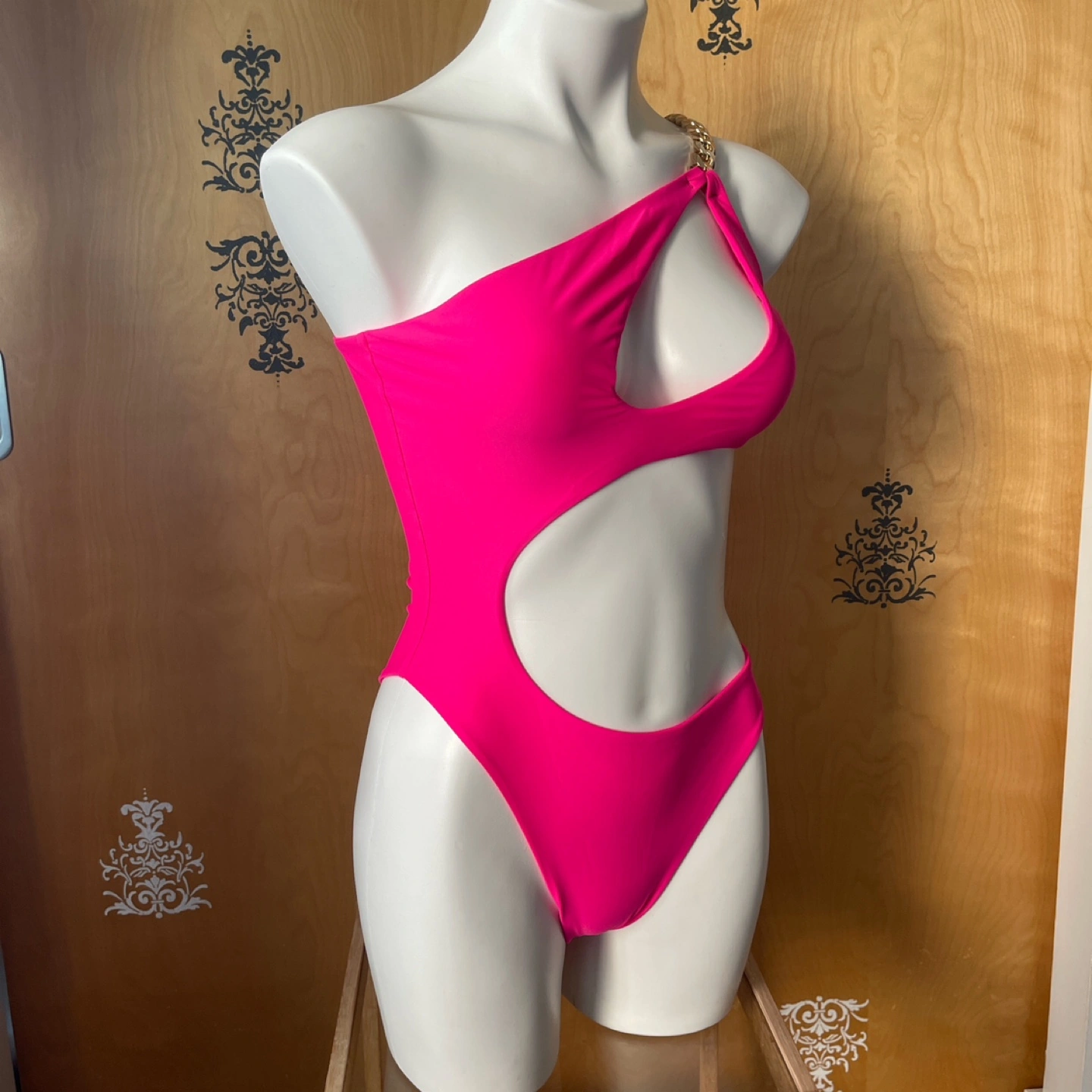 NWT Asymmetrical Keyhole Cut Out Hot Pink Monokini Gold Chain Detail M ***ALSO COMES IN SIZES SMALL & LARGE! PM ME! ✨MADE IN CANADA! 💎Condition: 10/10! NEW WITH TAG! Will be packaged in original garment bag & underlining protective sticker! This gorgeous unique one piece is bold, vibrant & sexy & highlights all your best features without sacrificing a bit of comfort. The luxury gold chain shoulder compliments the keyhole cut out over the bust This swimsuit bottom has moderate coverage & nicely sits over the hip to enhance your shape. Get creative and wear this style backward for a completely different look FEATURES Luxurious gold chain strap One shoulder Asymmetrical design Keyhole cutout Seamless Double layered construction Statement piece: a luxury bathing suit Content: Made from premium imported high quality lycra. 80% Nylon, 20% Spandex SIZE & FIT Fits true to size Mannequin is overall size medium US: 8-10 Bust: 34-36 Cup Size: B-C Waist: 27-29 Hips: 37-39