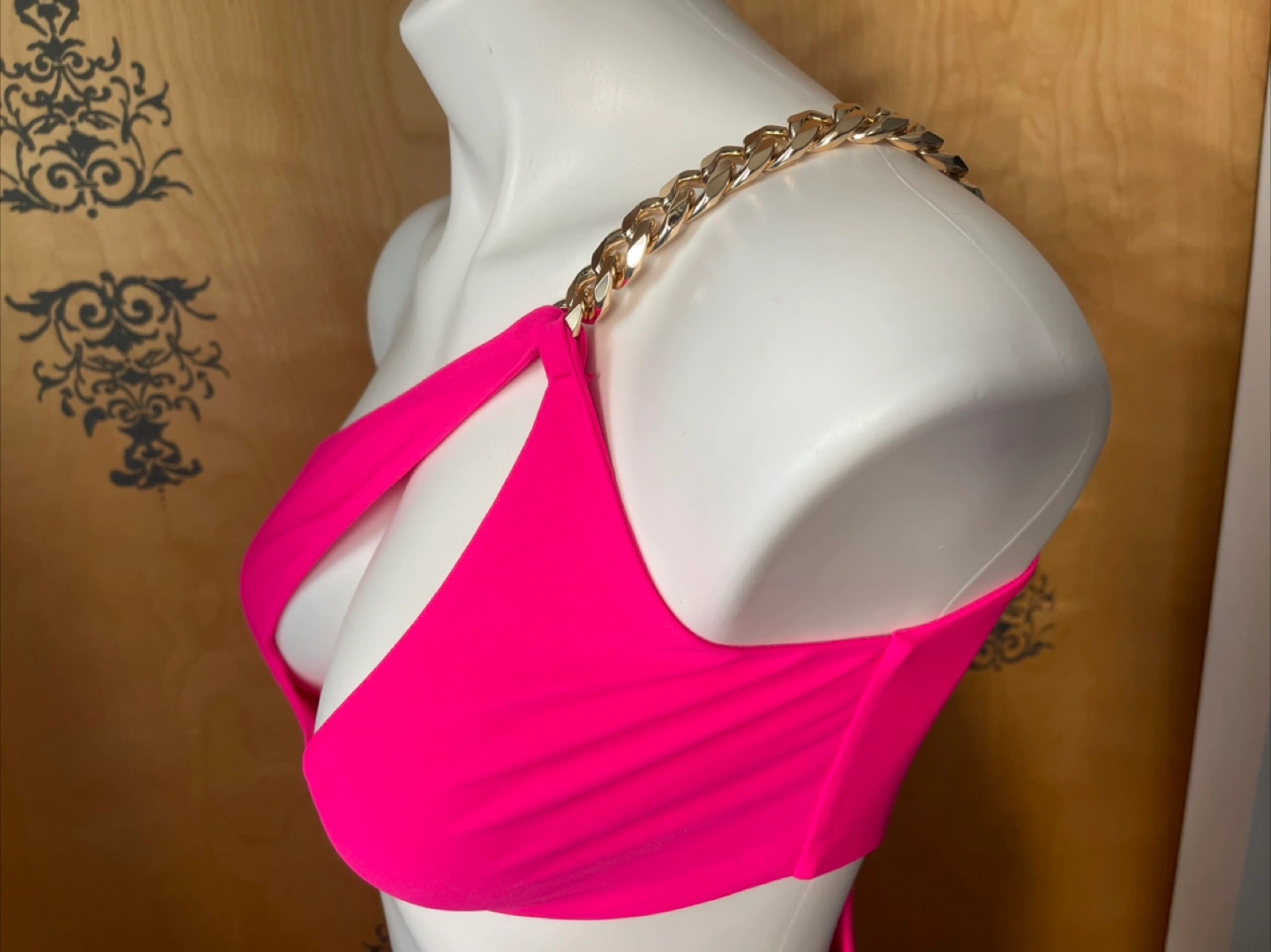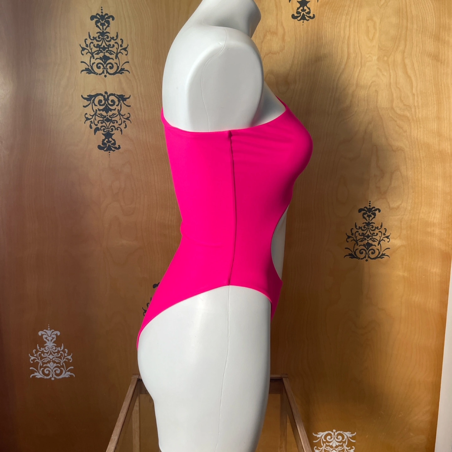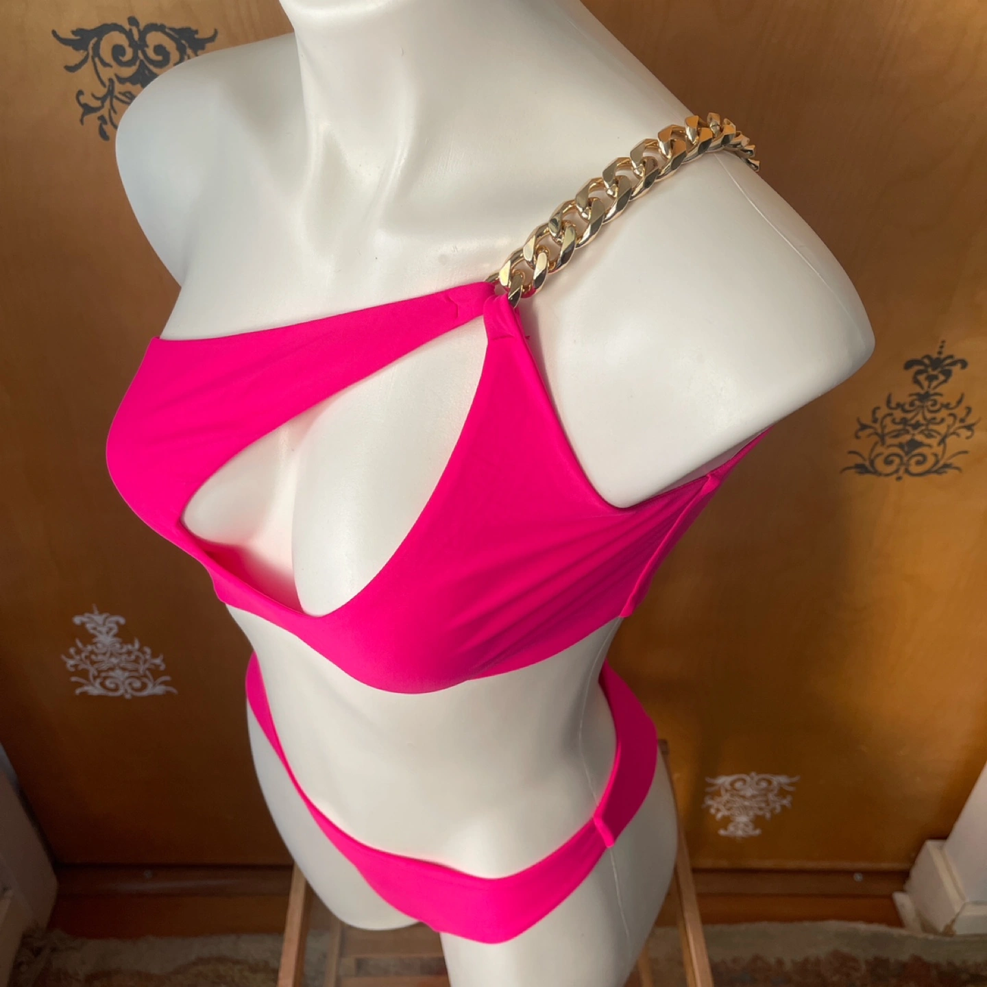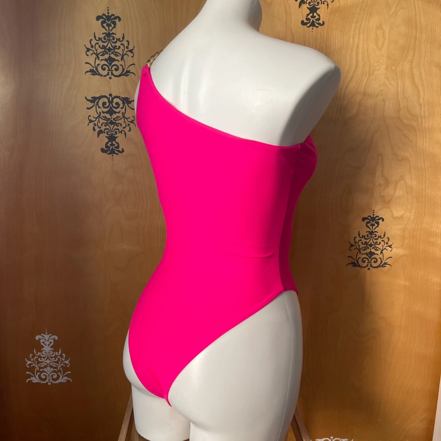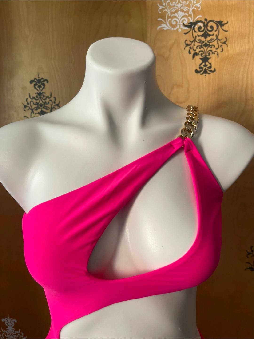 NWT Asymmetrical Keyhole Cut Out Hot Pink Monokini Gold Chain Detail M ***ALSO COMES IN SIZES SMALL & LARGE! PM ME! ✨MADE IN CANADA! 💎Condition: 10/10! NEW WITH TAG! Will be packaged in original garment bag & underlining protective sticker! This gorgeous unique one piece is bold, vibrant & sexy & highlights all your best features without sacrificing a bit of comfort. The luxury gold chain shoulder compliments the keyhole cut out over the bust This swimsuit bottom has moderate coverage & nicely sits over the hip to enhance your shape. Get creative and wear this style backward for a completely different look FEATURES Luxurious gold chain strap One shoulder Asymmetrical design Keyhole cutout Seamless Double layered construction Statement piece: a luxury bathing suit Content: Made from premium imported high quality lycra. 80% Nylon, 20% Spandex SIZE & FIT Fits true to size Mannequin is overall size medium US: 8-10 Bust: 34-36 Cup Size: B-C Waist: 27-29 Hips: 37-39