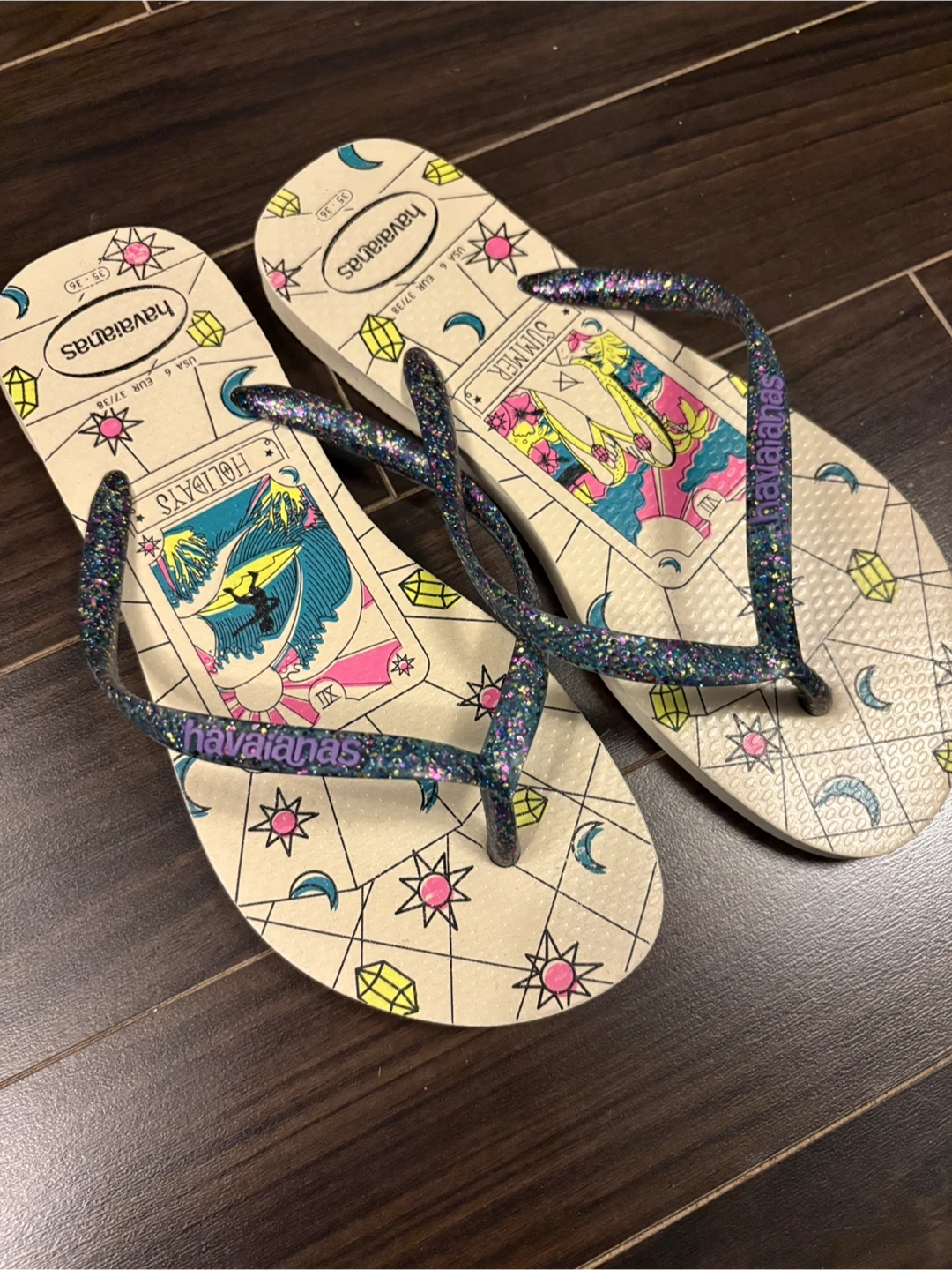 Cute Havaianas Slim flip flops featuring a Summer Holidays design! They are a size 6 (US size). Perfect for adding a bit of fun to your summer wardrobe!
