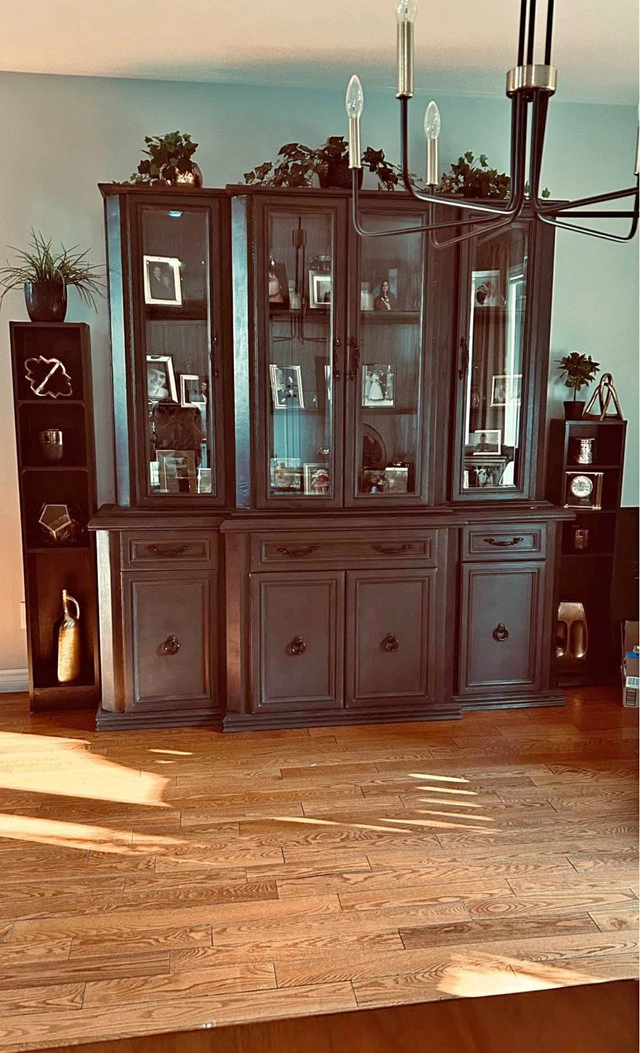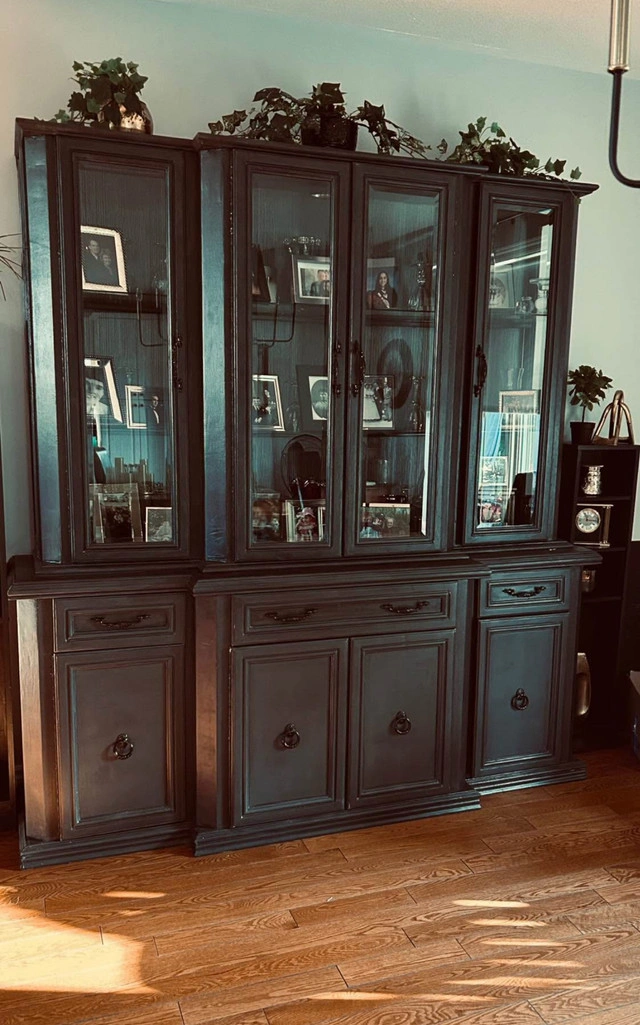 Refinished in charcoal grey. 74 inches long, 78 inches high, 20 inches deep. Pick up only!