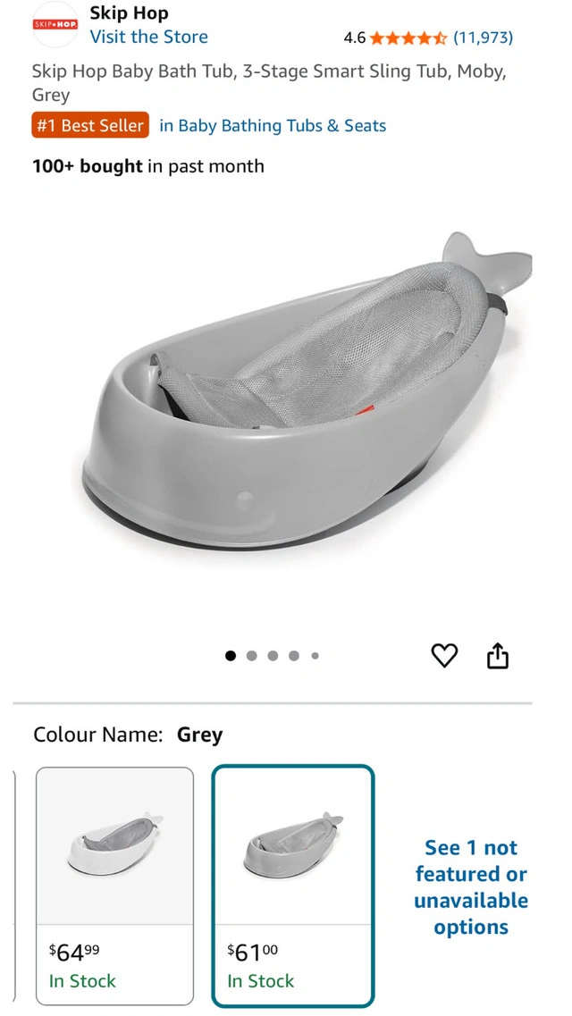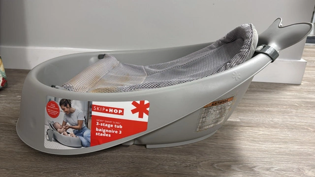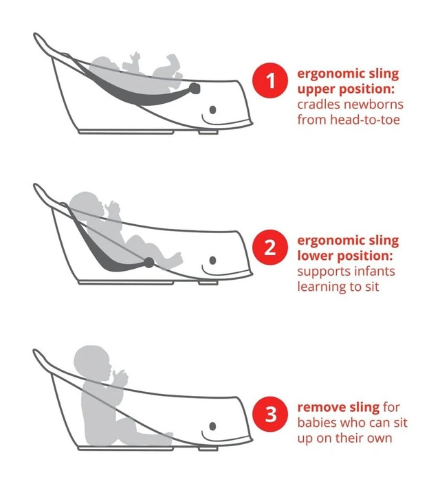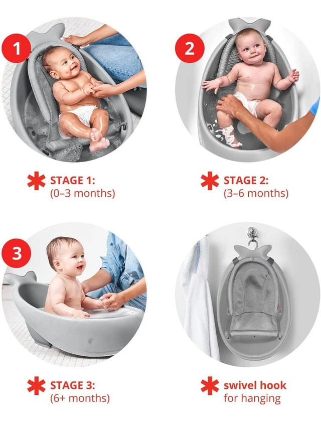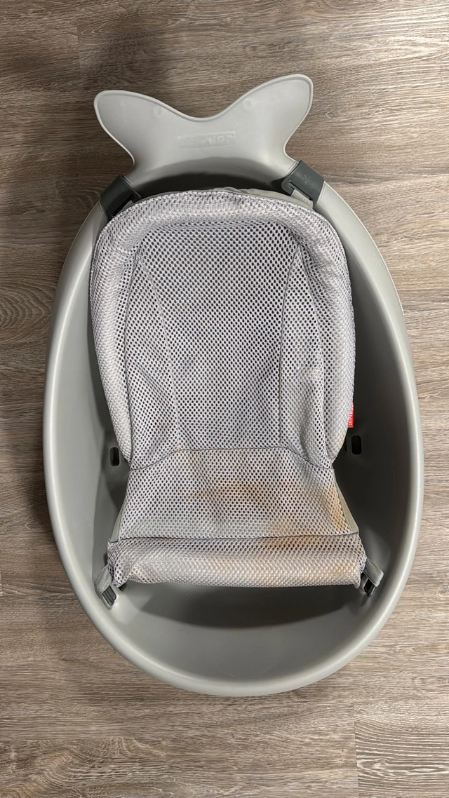 Brown color on net is stain and we aren’t able to remove it. It’s not a dirt. It doesn’t have any other issues It can be used in 3 different sizes as shown in picture. Product Dimensions 48.3L x 29.5W x 69.9H Centimetres Item weight 1.36 kg Cheerful whale shaped Moby tub grows with baby through three stages and offers Smart Sling support The sling locks into two ergonomic positions: higher for full body support and lower for seated support Dual layered mesh and comfort edge construction securely cradles baby from head to toe The slings adjusts to a cushioned seat that comfortably supports babies learning to sit Remove the sling when baby has mastered sitting and easily bathe baby in the spacious tub no uncomfortable plastic bumps For Sale By: Owner