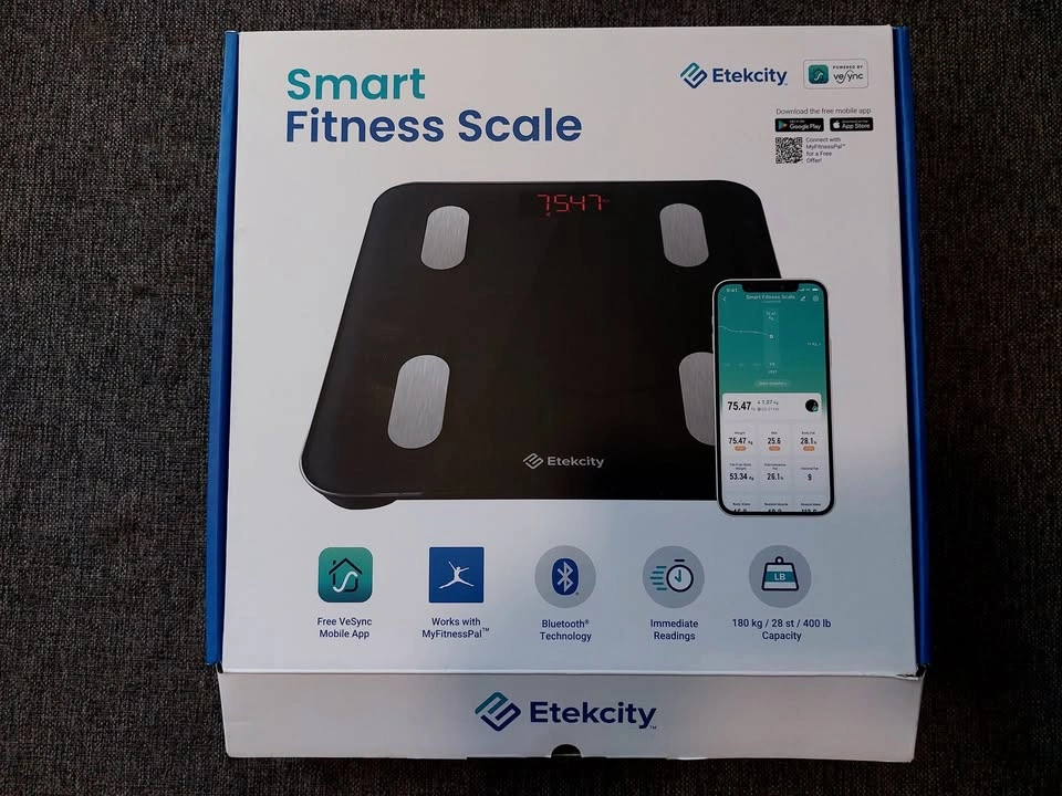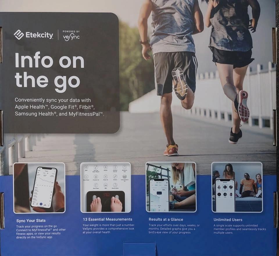 ESF24 Smart Fitness Scale, excellent condition, original box. This bathroom scale provides 13 essential measurements, including Weight, BMI, Body Fat, Visceral Fat, Muscle Mass, Bone Mass, Body Water, and more. All kinds of statistics and numbers will guide you to maintain a healthy lifestyle. Connect your smart scale to the free VeSync app to view 13 essential body measurements and sync your results with Apple Health, Google Fit, and Fitbit.