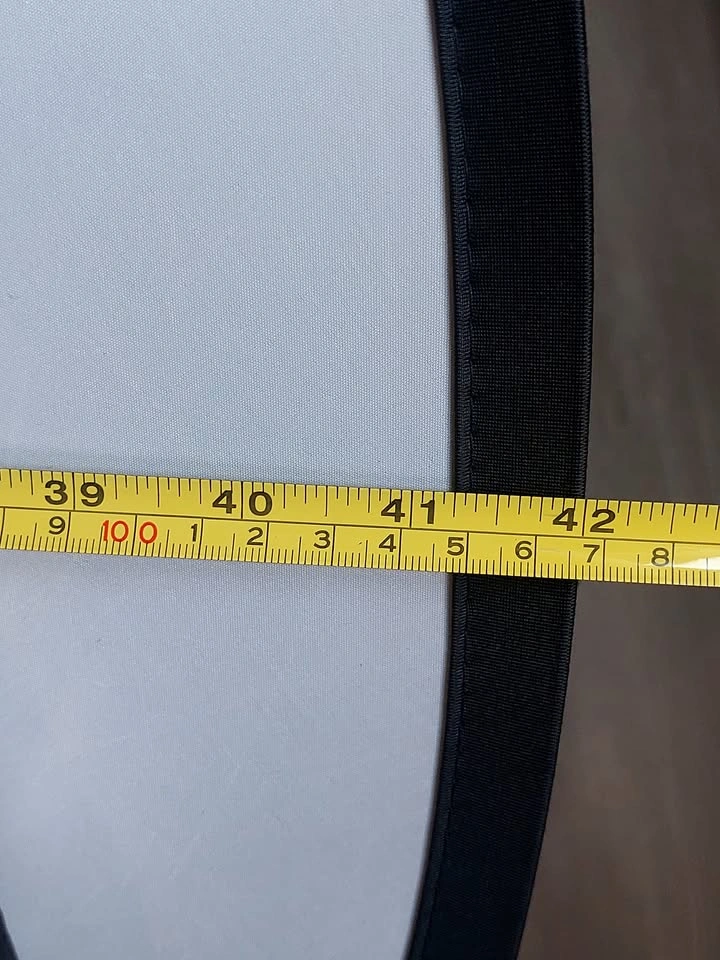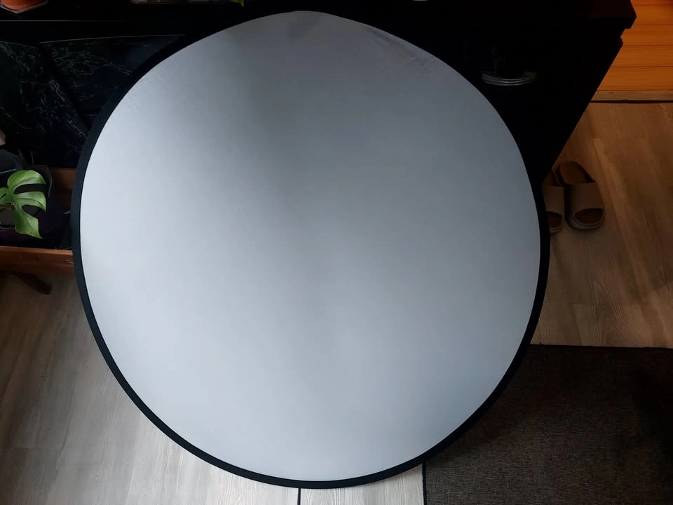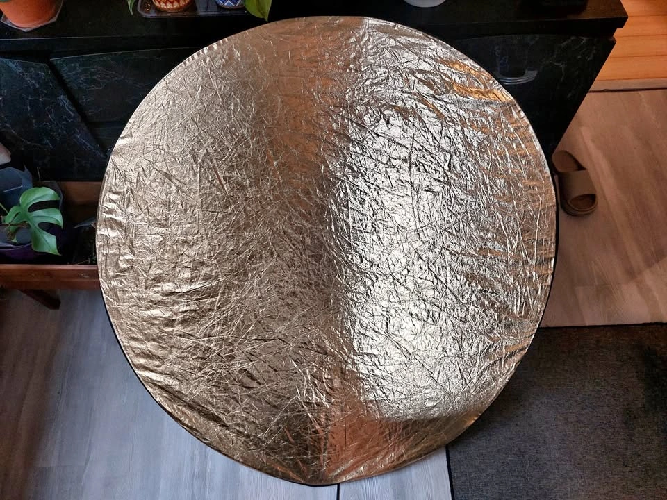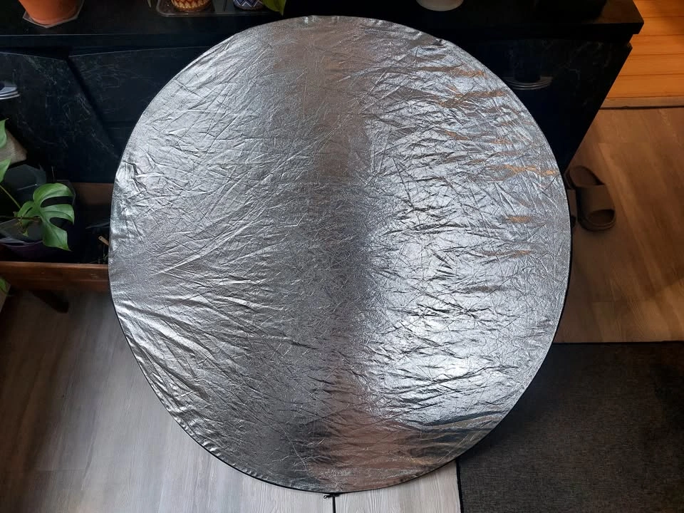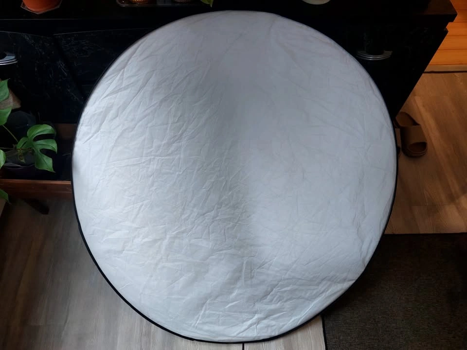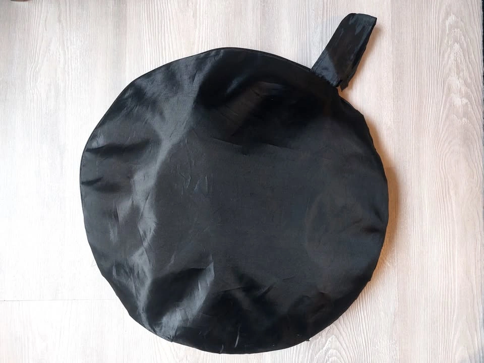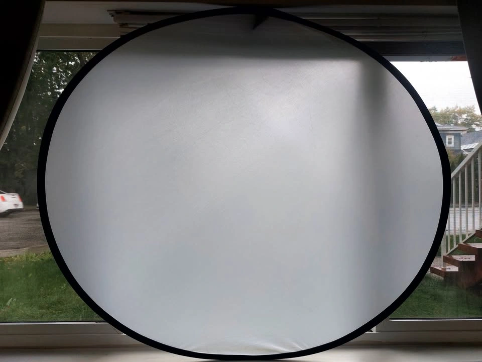 42" round photography reflector. 5-in-1 surfaces: silver reflector, gold reflector, white reflector, black, and diffusion screen. Folds into 1/3 its size, includes a zippered bag for storage.