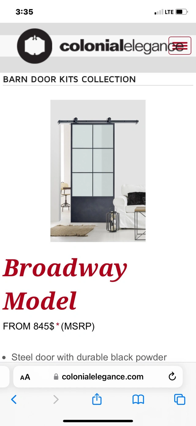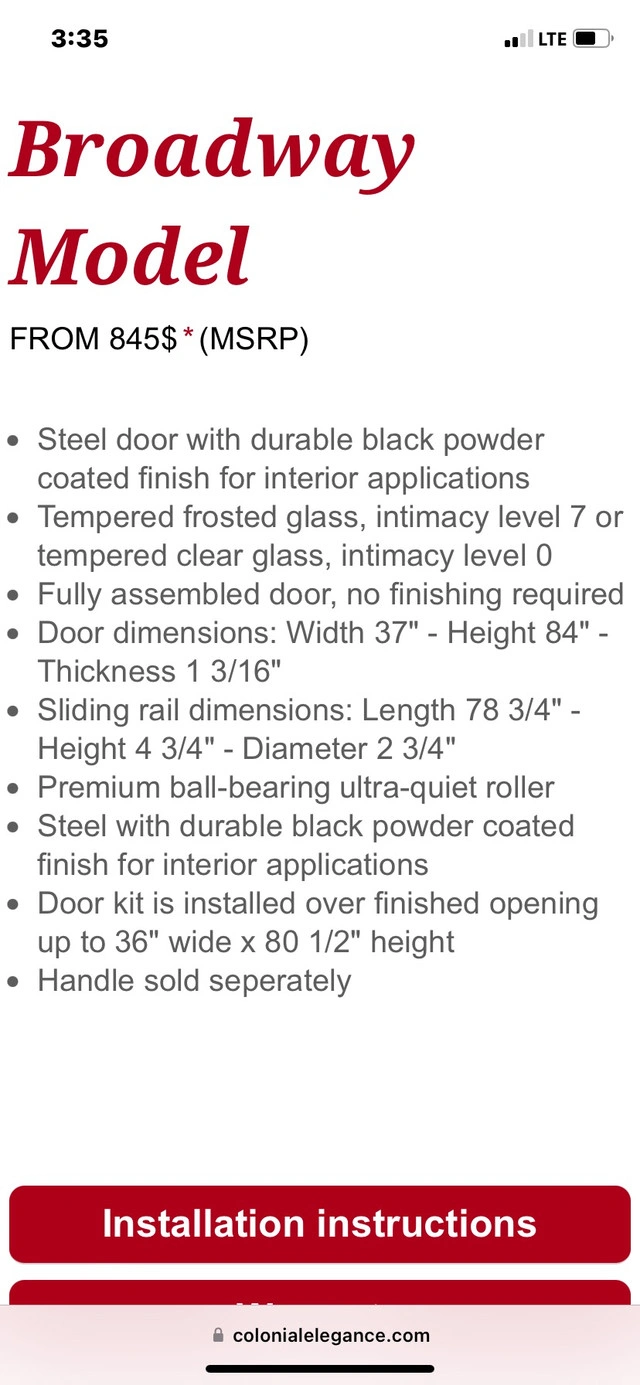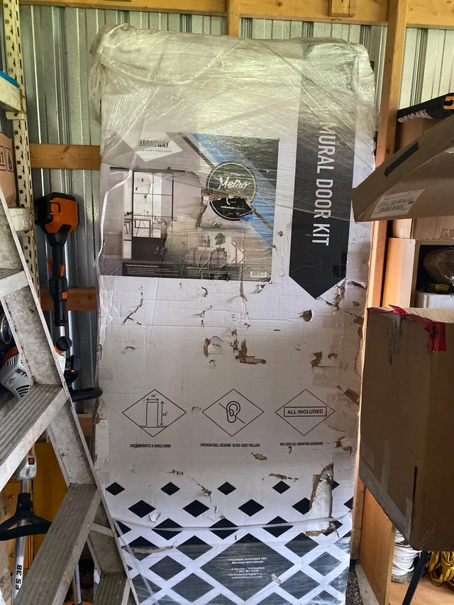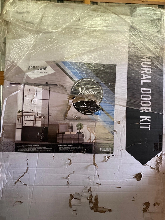Broadway mural door kit. Clear glass, 37” width, 84” height, 1 3/16” thickness. New, never used.