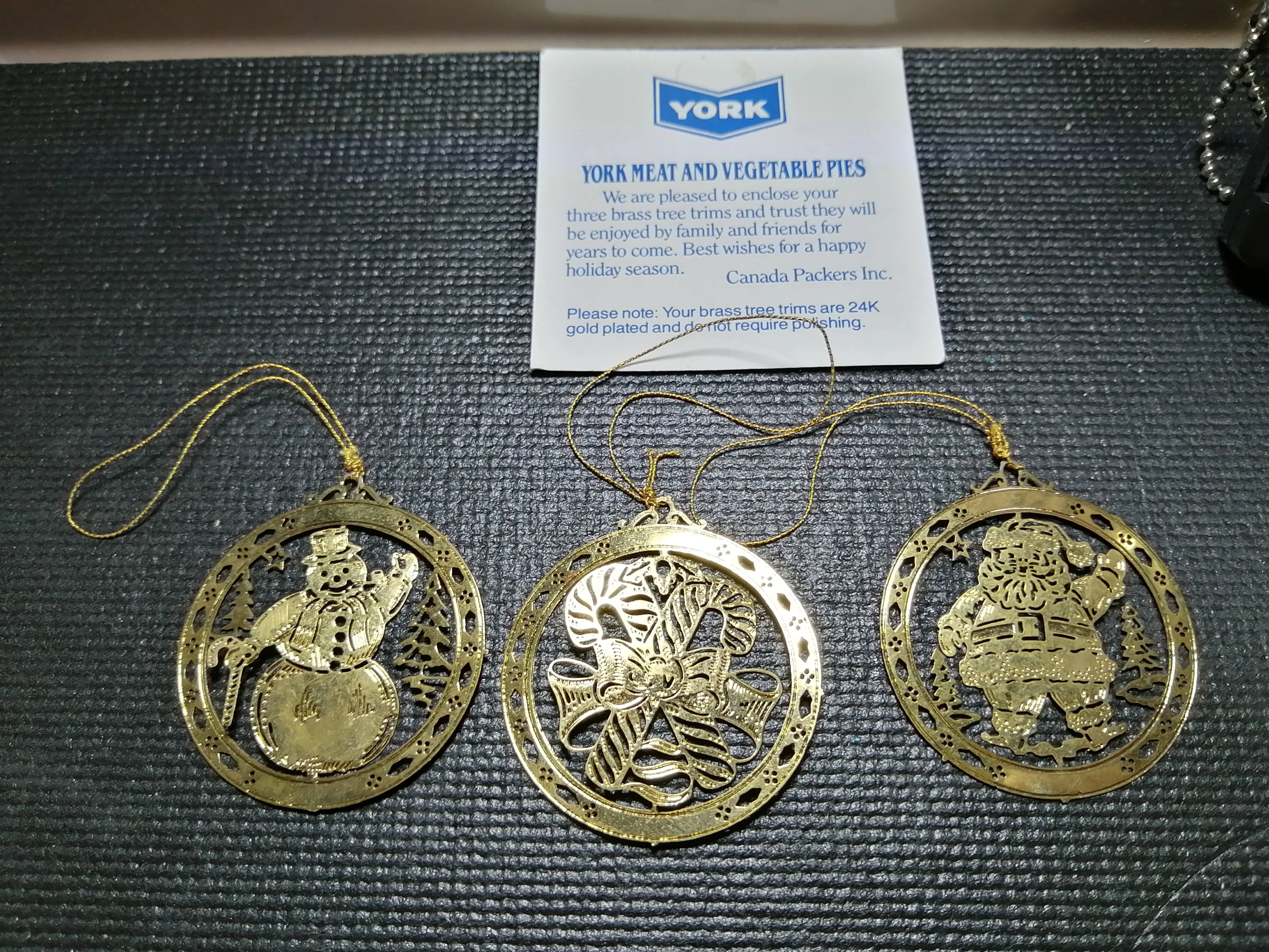 Located in OSHAWA ... Ritson Road North and Taunton Road area MINT CONDITION , WELL KEPT Set of 24K Gold Plated Christmas Ornaments Manufacturer: Canada Packers Inc. (York Meat and Vegetable Pies) Release Year: 1981 Description in original card provided by York Meat and Vegetable Pies.