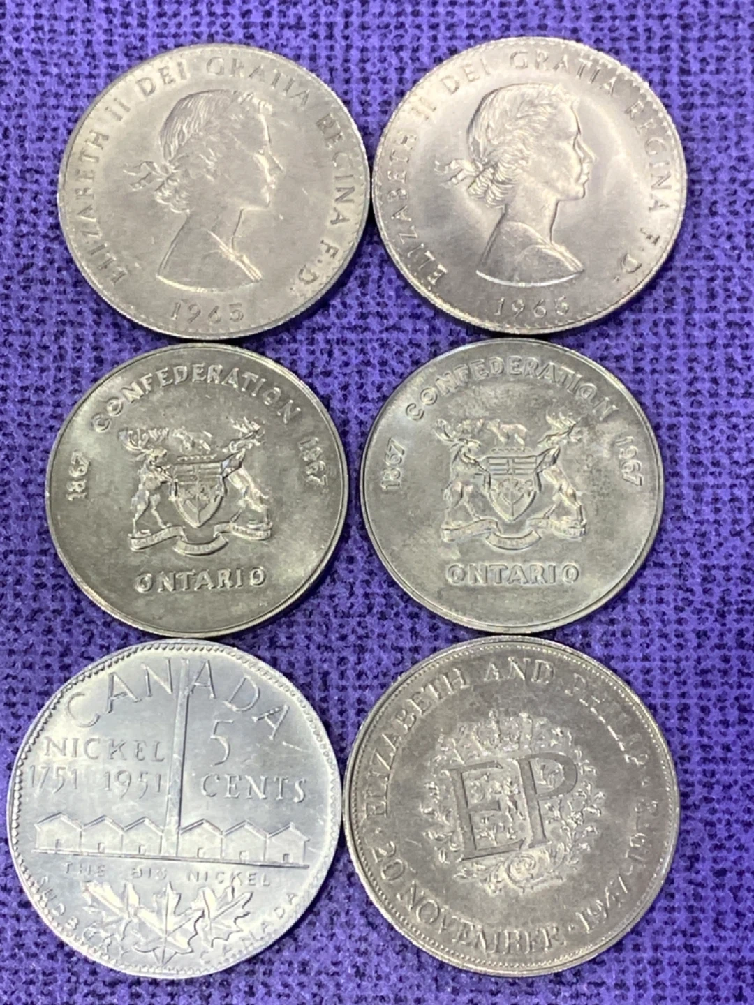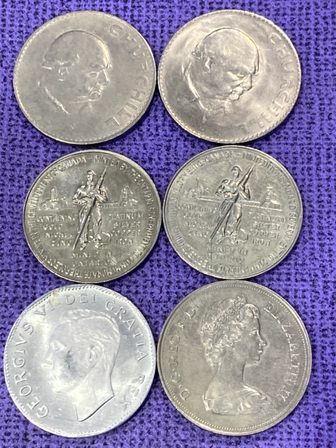 Selling a set of Canadian coins featuring portraits of Churchill, Elizabeth II, and George VI. These coins commemorate the development of Canada and the role of mining in Ontario. A nice addition to any collection!