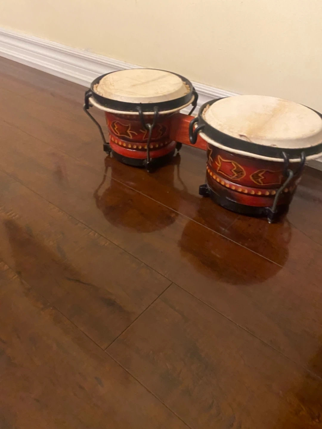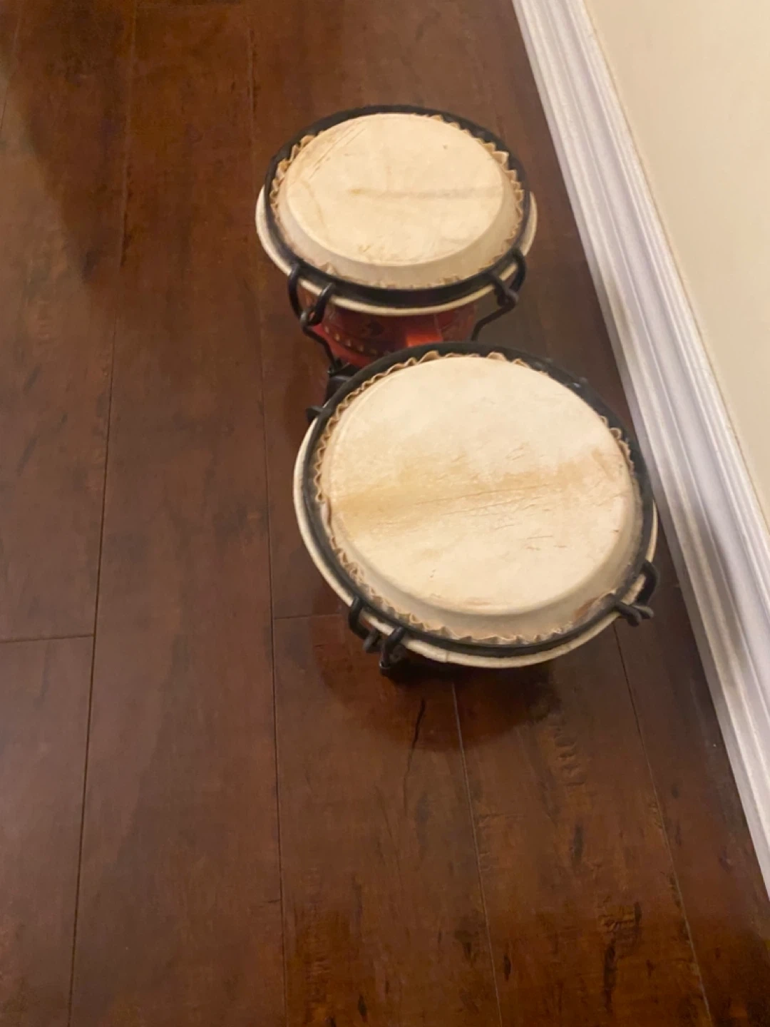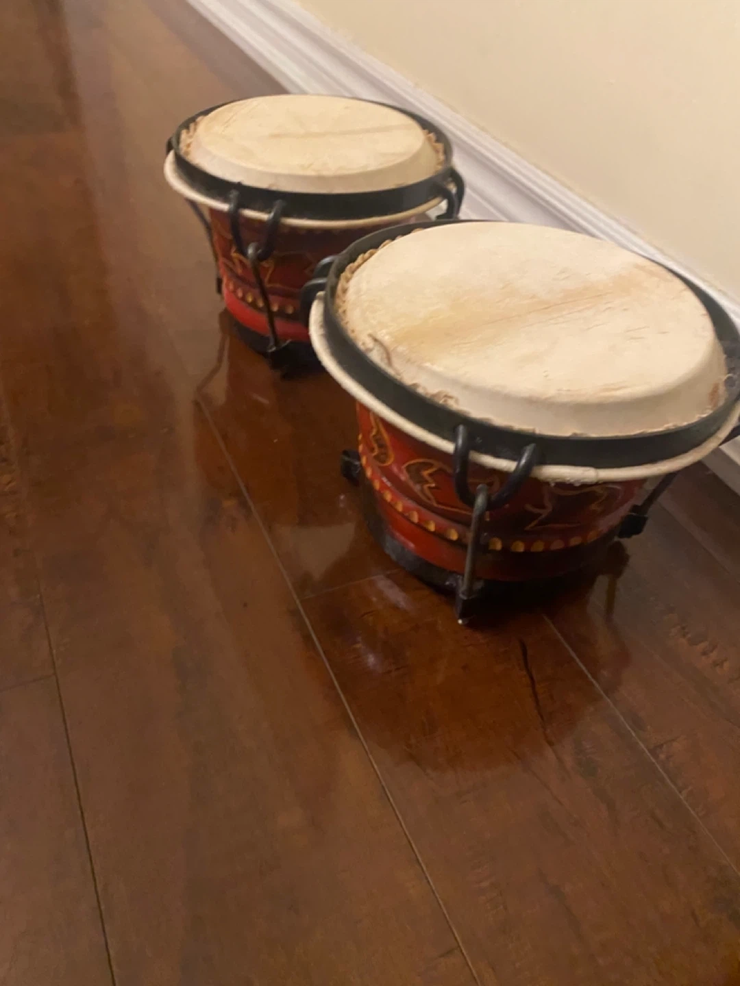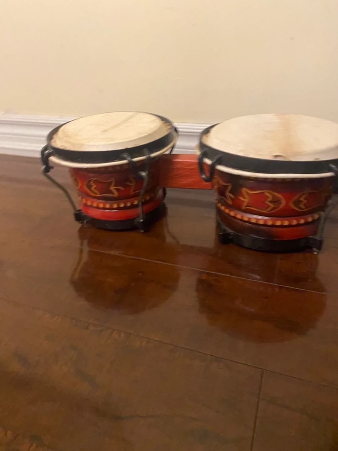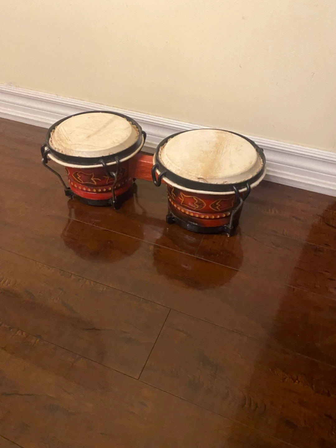 Selling a set of bongo drums! These are in good condition and ready for someone to make some music. They have a red and black design on the sides.