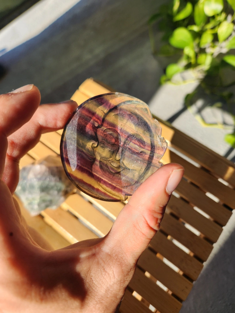 Selling a beautiful fluorite crystal pyramid and a moon carving. The pyramid has a unique shape and colour. The moon carving has a lovely design. Perfect for adding a touch of nature to your space!