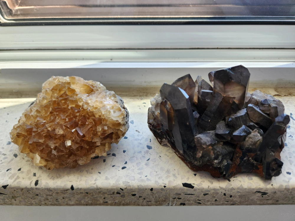 Selling two mineral stone clusters. One is a golden colour and the other is dark brown. They would be great for a collection or for decoration!