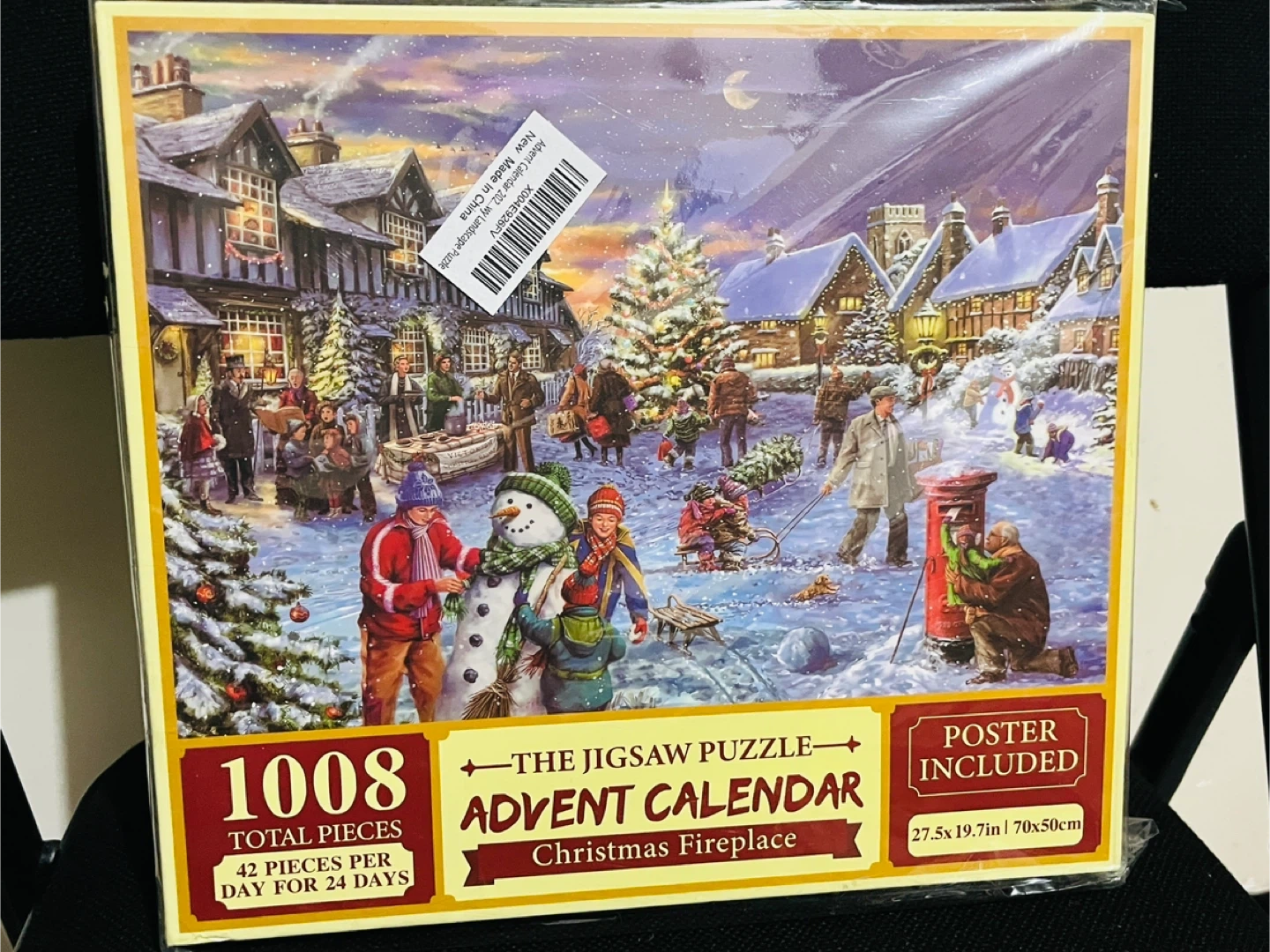 I'm selling a jigsaw puzzle advent calendar featuring a Christmas Fireplace scene! It has 1008 total pieces, with 42 pieces for each of the 24 days. A poster is also included, sized at 27.5 x 19.7 inches (70x50cm)