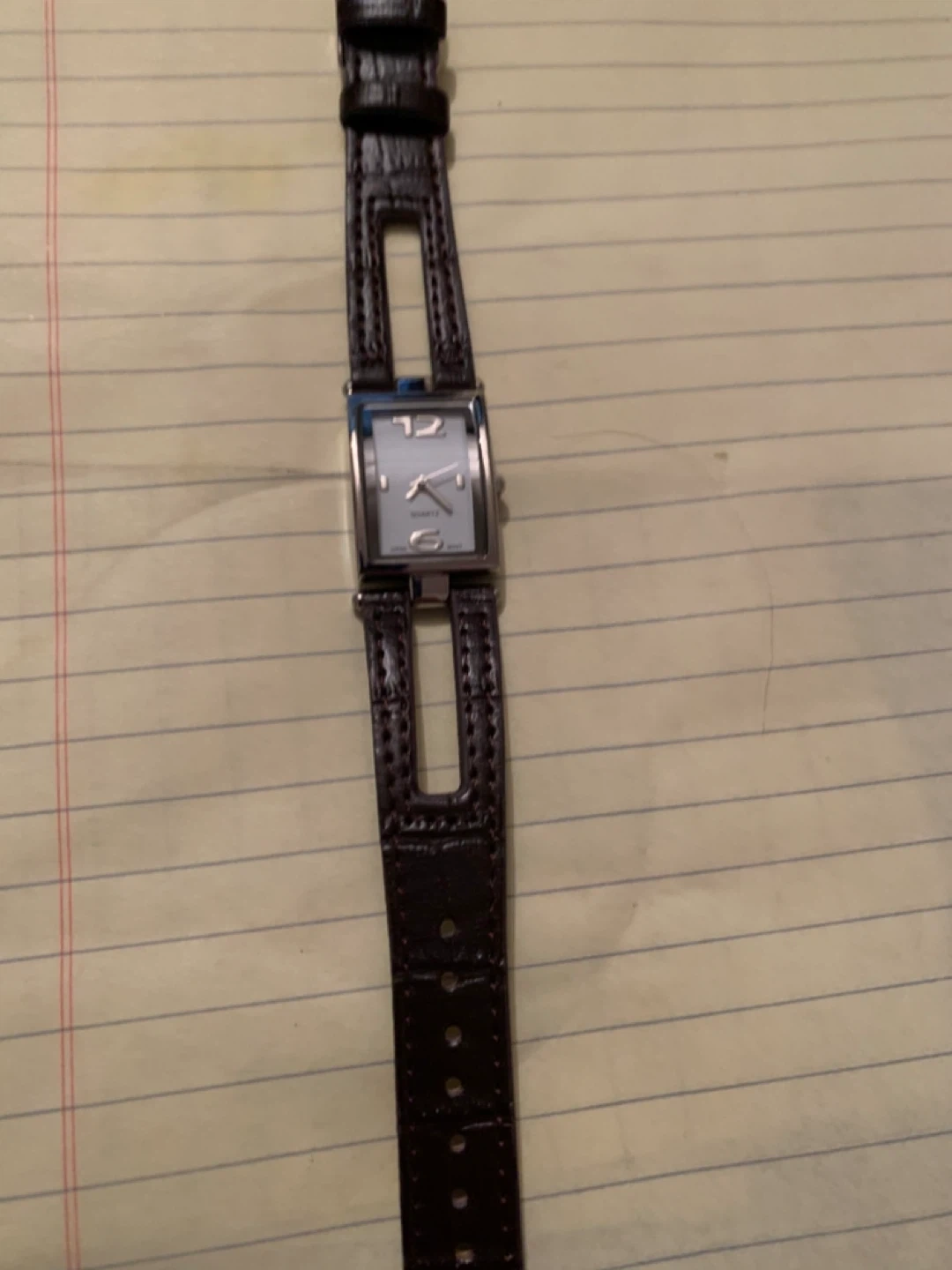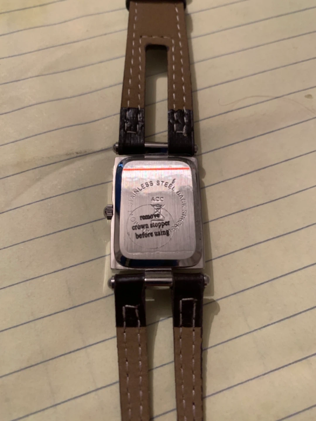Selling a stylish ACC quartz watch with a unique square face and a brown leather band. The watch has a stainless steel back and a clean, minimalist design. It's in good condition and ready to wear!