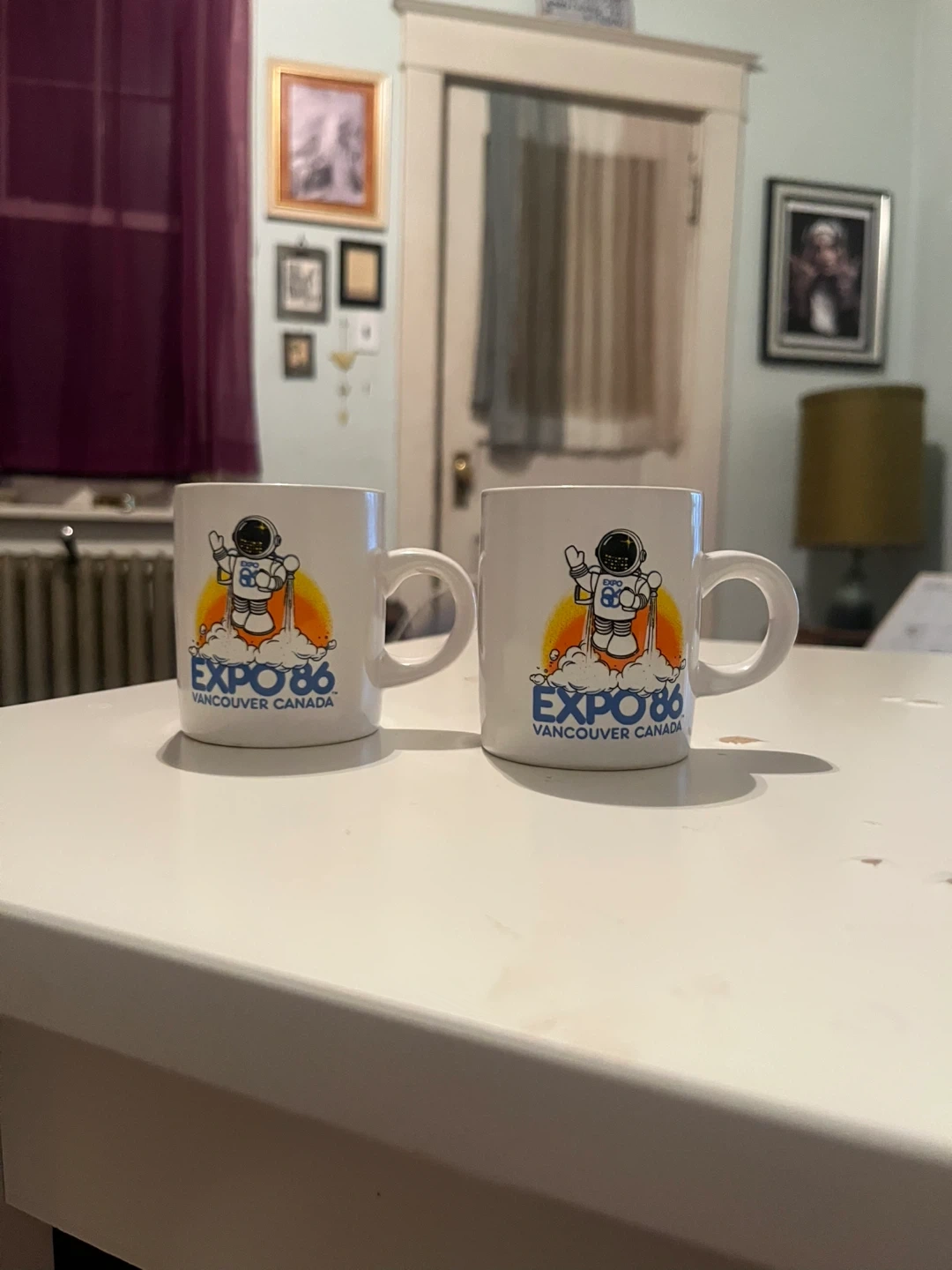 Vintage EXPO 86 Vancouver, Canada Ceramic Mini Coffee Mug Tea Cup 2-5/8" or Espresso Coffee Cups, Set of Two, White with Blue Print, Astronaut Design. Measure about 2 1/8" in diameter and about 2 1/2" tall. Great condition Cash Only Please