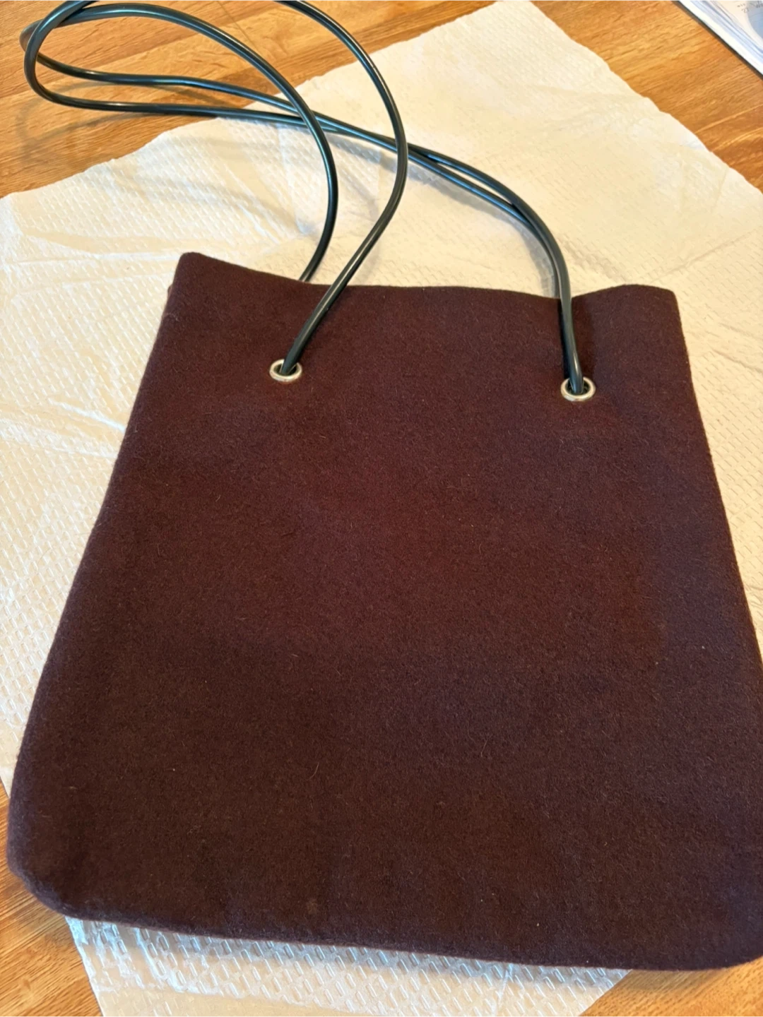 Ladies dark brown felt handbag, has one inside zipper pocket and a snap closure. Measure’s length 12.5” width 12”