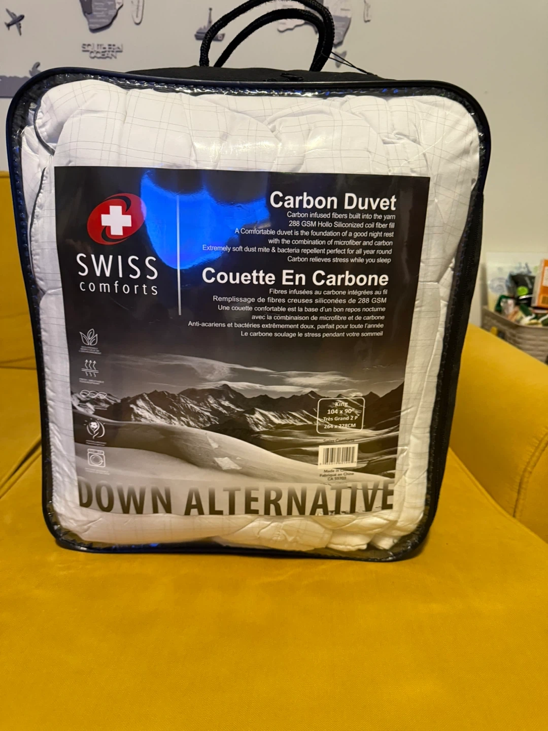 I'm offering a brand new Swiss Comforts Carbon Duvet, designed with extremely soft dust mite and bacteria repellent material, perfect for all-year-round comfort! It's still sealed in its original packaging, ensuring it's untouched and ready to provide you with the best sleep experience. Additional features include: Available king size Microfiber, carbon fiber® shell Dust mite & bacteria repellant Hypoallergenic King: 228 cm × 264 cm (90 in. × 104 in.) If the ad is up, the duvet is available and ready to go to a new home! Snatch it up before someone else does! Pick up in Lower Mount Royal . Please check out more of my items and get a good deal.