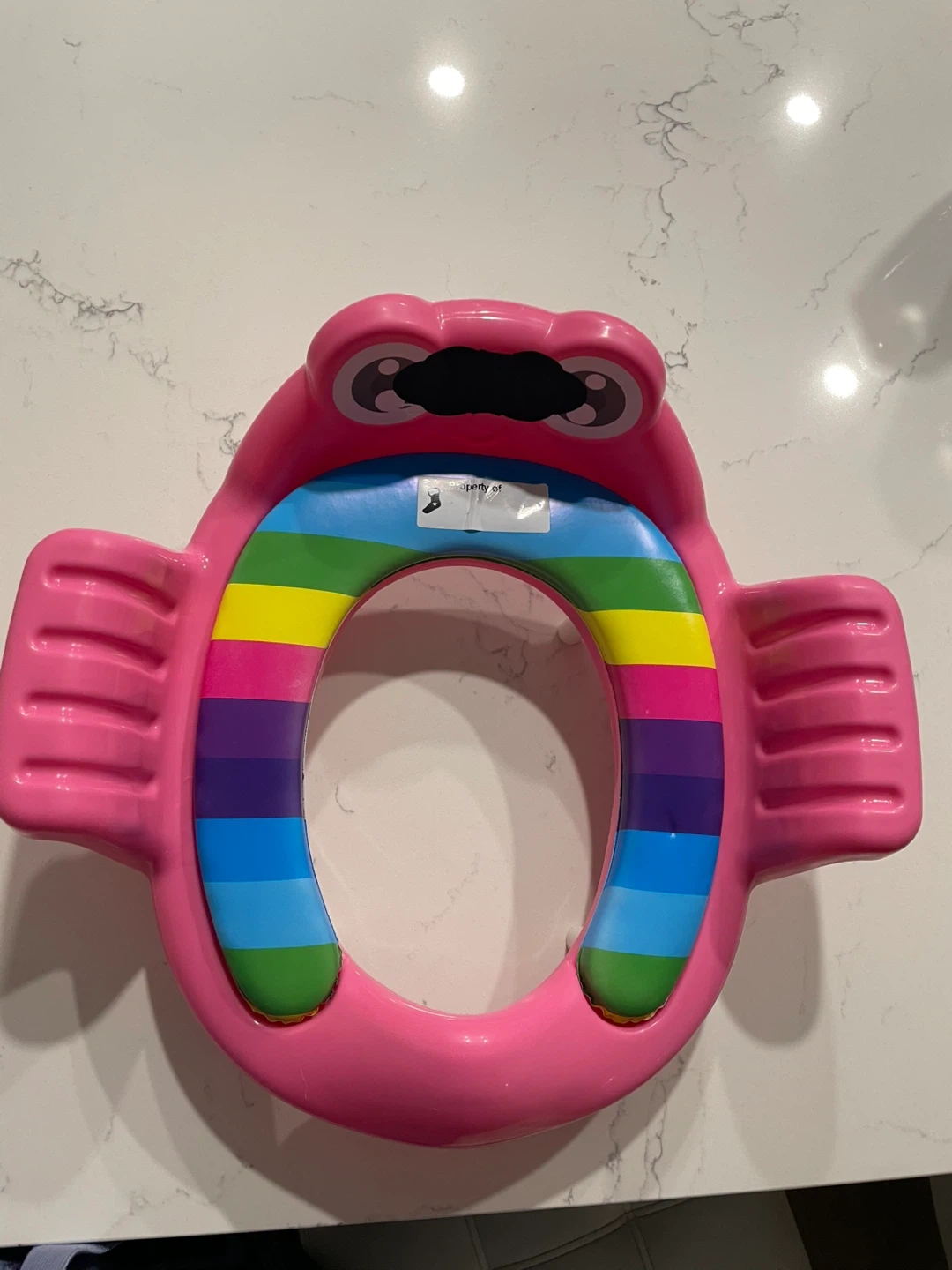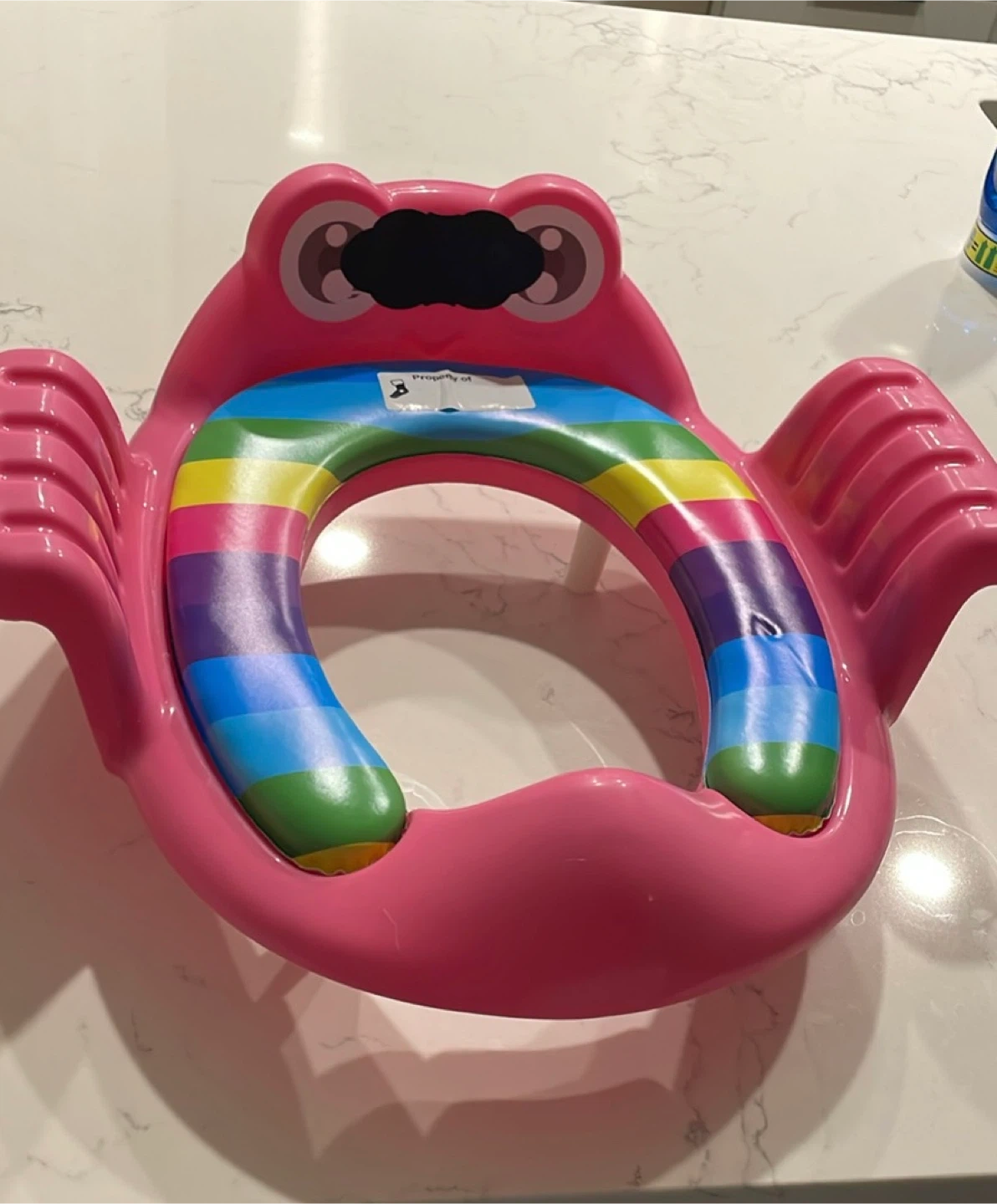 Here's a cute pink froggy potty seat! It has a colourful rainbow stripe design on the seat. Great for potty training your little one