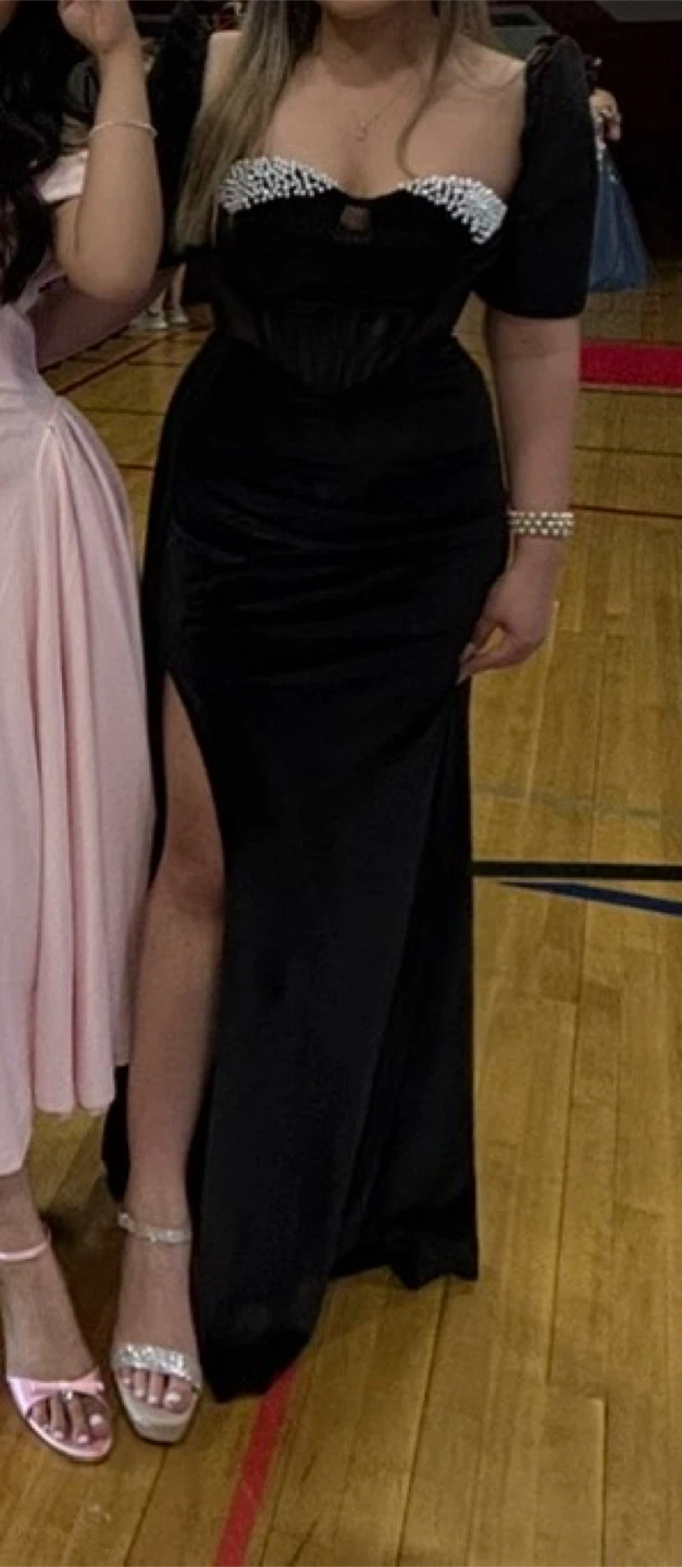 Selling a beautiful black formal dress! It features a stylish slit and a flattering silhouette. Perfect for prom or any special occasion. The dress is in great condition!