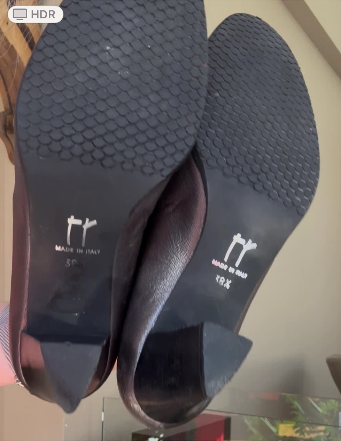 THIERRY RABOTIN metallic leather heels in a size 8. Unique design with a black elastic cuff and a block heel. The left shoe has some minor colour unevenness on the heel. See pic. These shoes have been meticulously cleaned and sanitized. From a smoke free, pet free home. Pick up in Alta Vista.