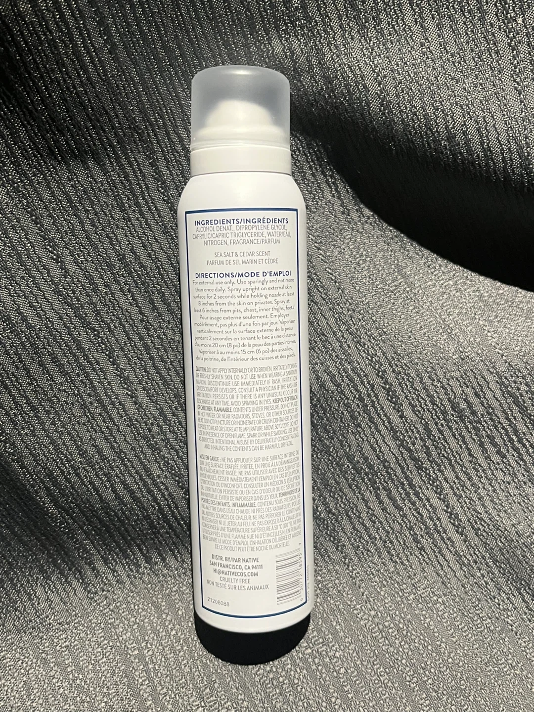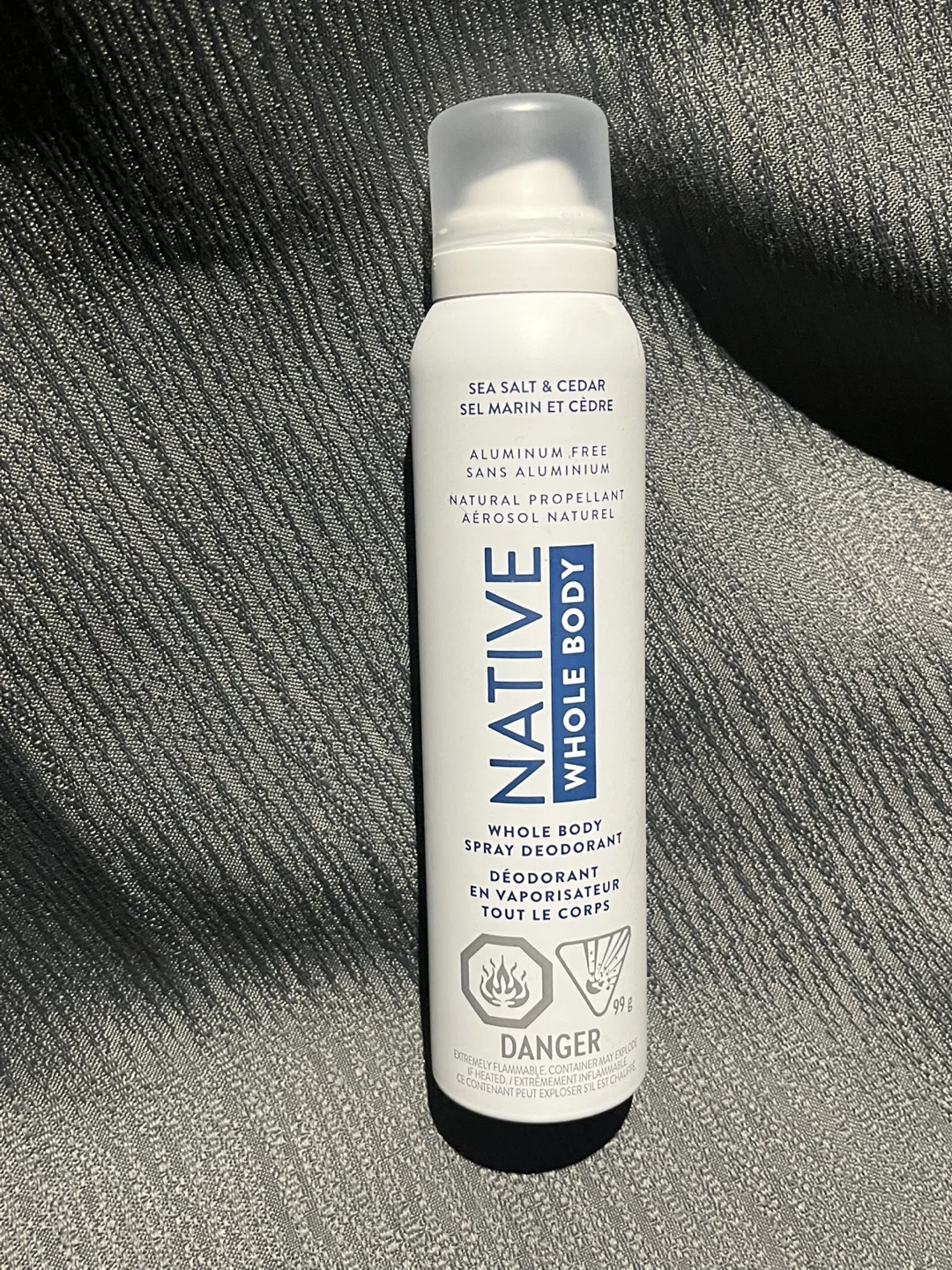 Selling a Native Whole Body spray deodorant in the Sea Salt & Cedar scent! It's aluminum-free and uses a natural propellant. The can contains 99g of product. Perfect for staying fresh on the go