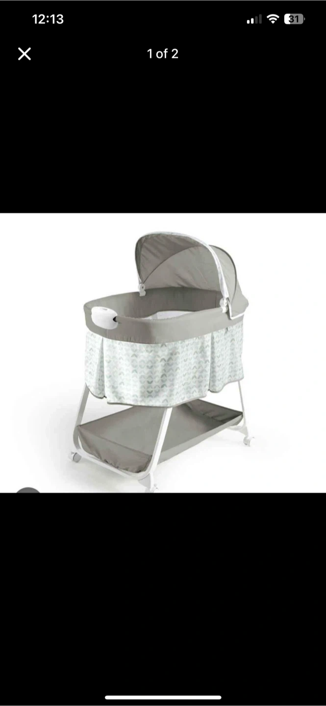 Selling a baby bassinet. It has a nice grey colour and a canopy to keep the sun out. There's also a storage shelf underneath for diapers and wipes. It's in great condition and ready for a new home!