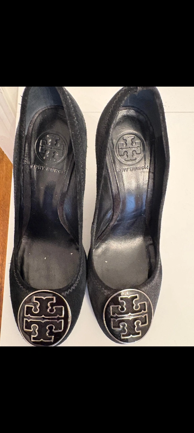 Selling a pair of Tory Burch heels in black suede. They have the iconic Tory Burch logo on the front. Perfect for a night out!